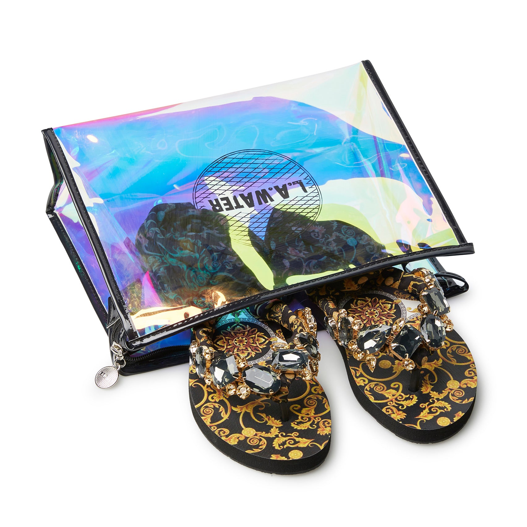 Le ciabattine sono elegantemente confezionate in pratiche pochette in stile “mermaid pic”, tutte con il logo L.A. WATER. Ogni paio è corredato di accessori glamour da indossare sia in spiaggia sia in città.