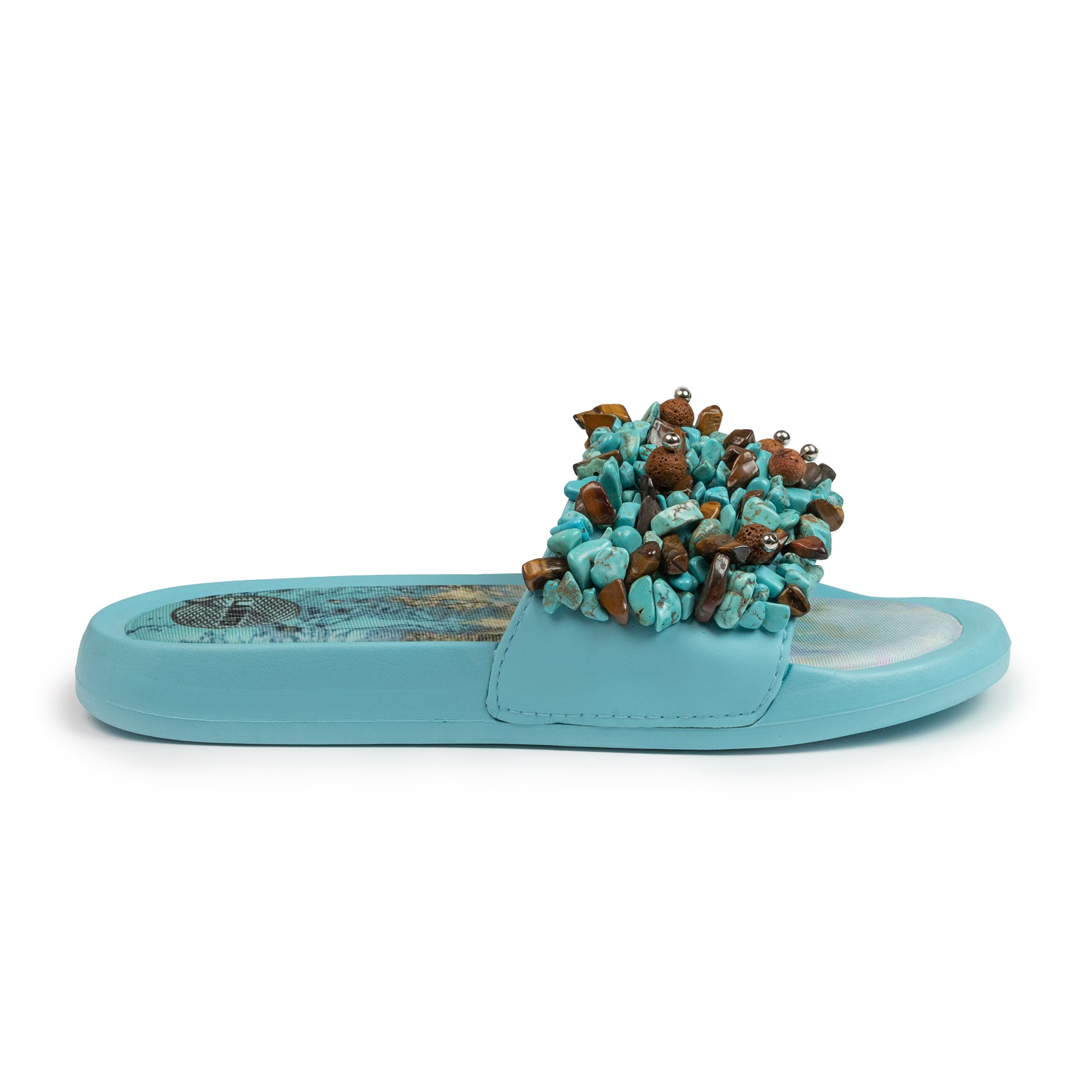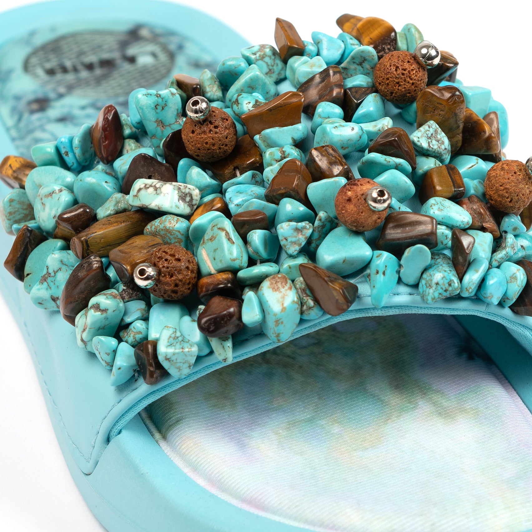 La fascia color turchese è splendidamente impreziosita da ciottoli marini nelle tonalità del turchese e del marrone.