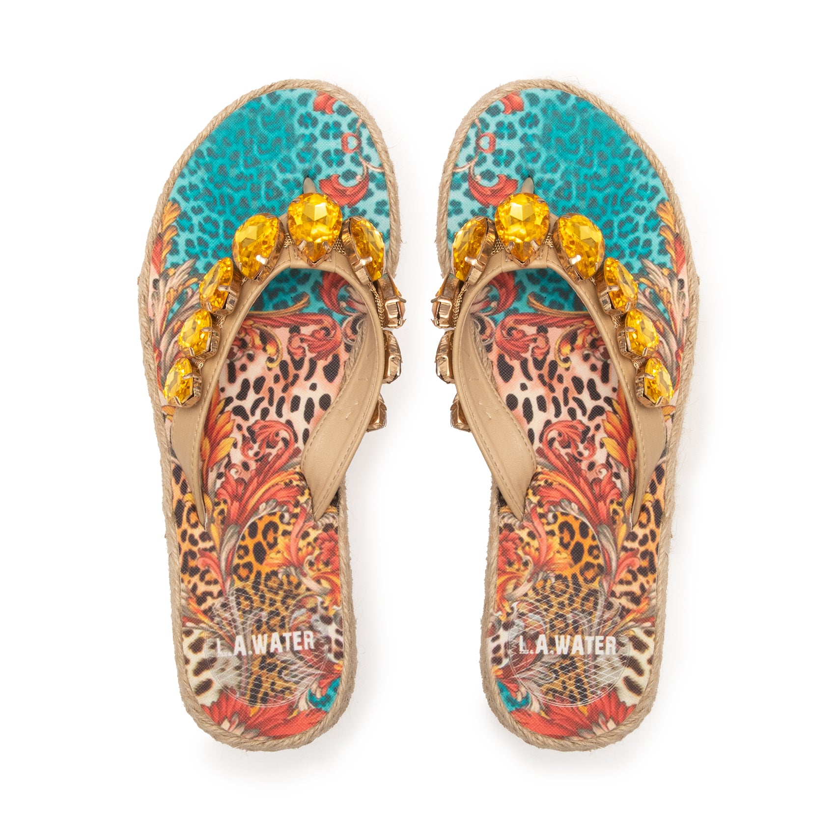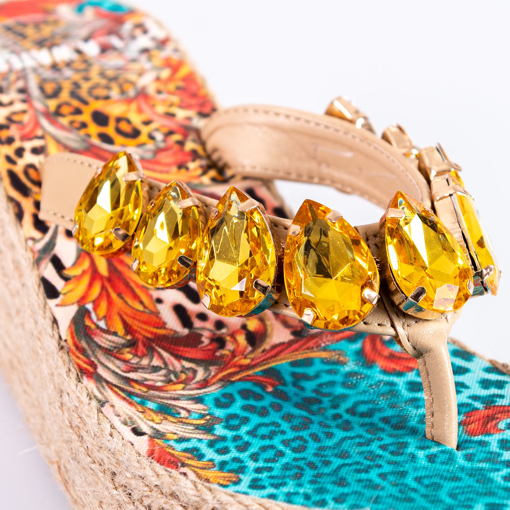 Sandalo con zeppa fusa dal design raffinato con stampa leopardata super colorata e fiori tropicali.