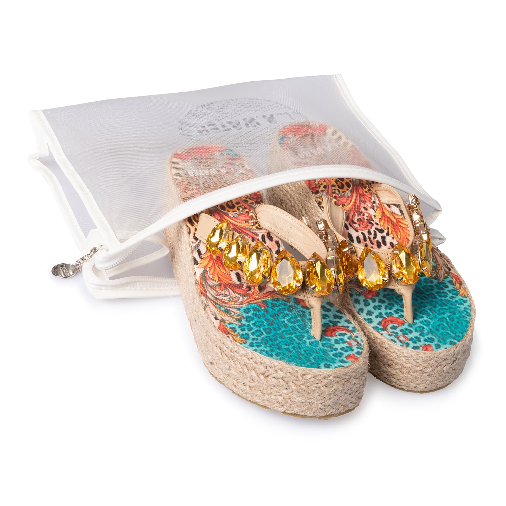 Packaging: Tutte le ciabatte sono elegantemente confezionate in pratiche bustine in rete bianca con logo L.A. WATER. Sono i tuoi accessori glamour da indossare con orgoglio, sia in spiaggia che in città.