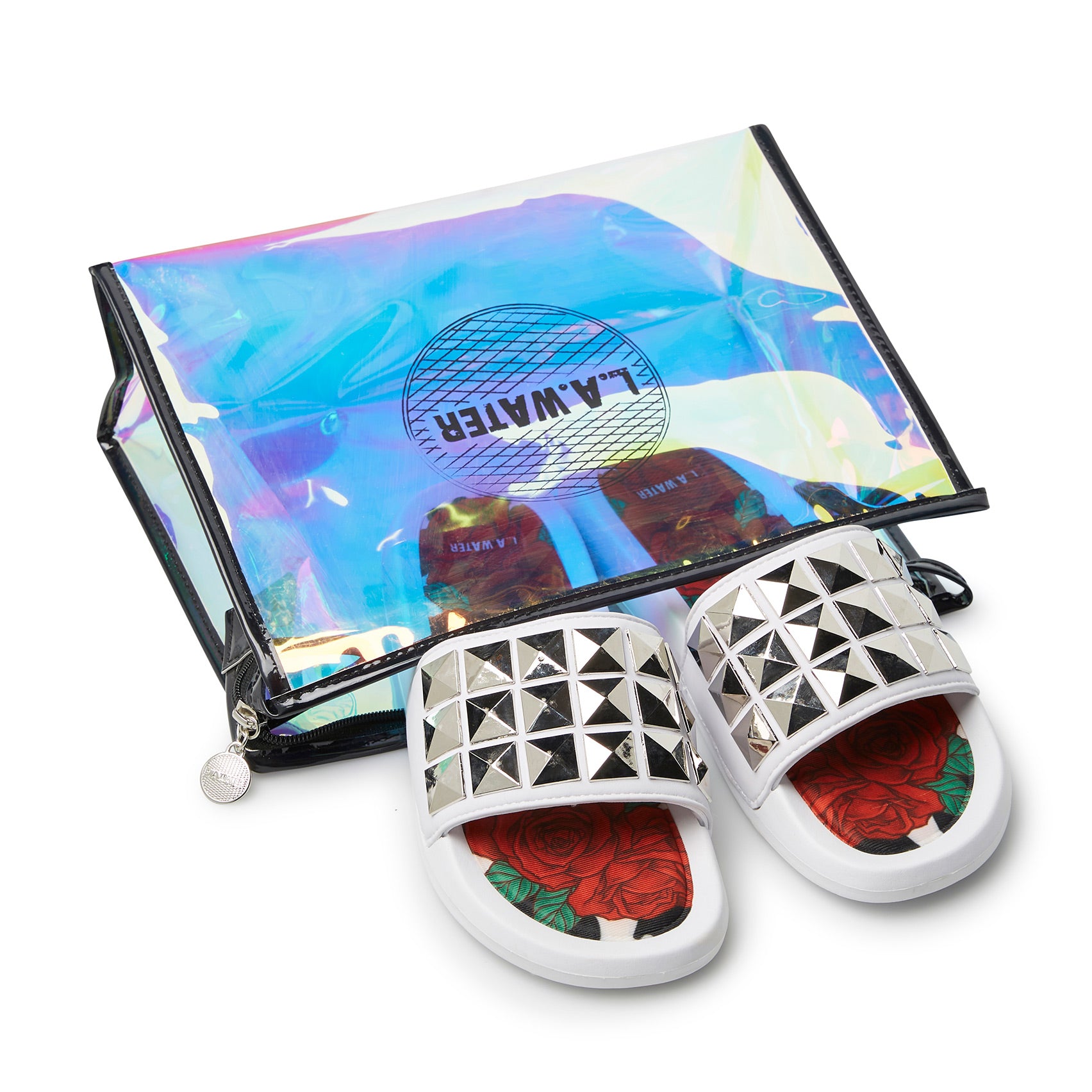 Gli slider sono elegantemente confezionati in pratiche pochette in stile “mermaid pic”, tutte con il logo L.A. WATER. Ogni paio è corredato di accessori glamour da indossare sia in spiaggia sia in città.