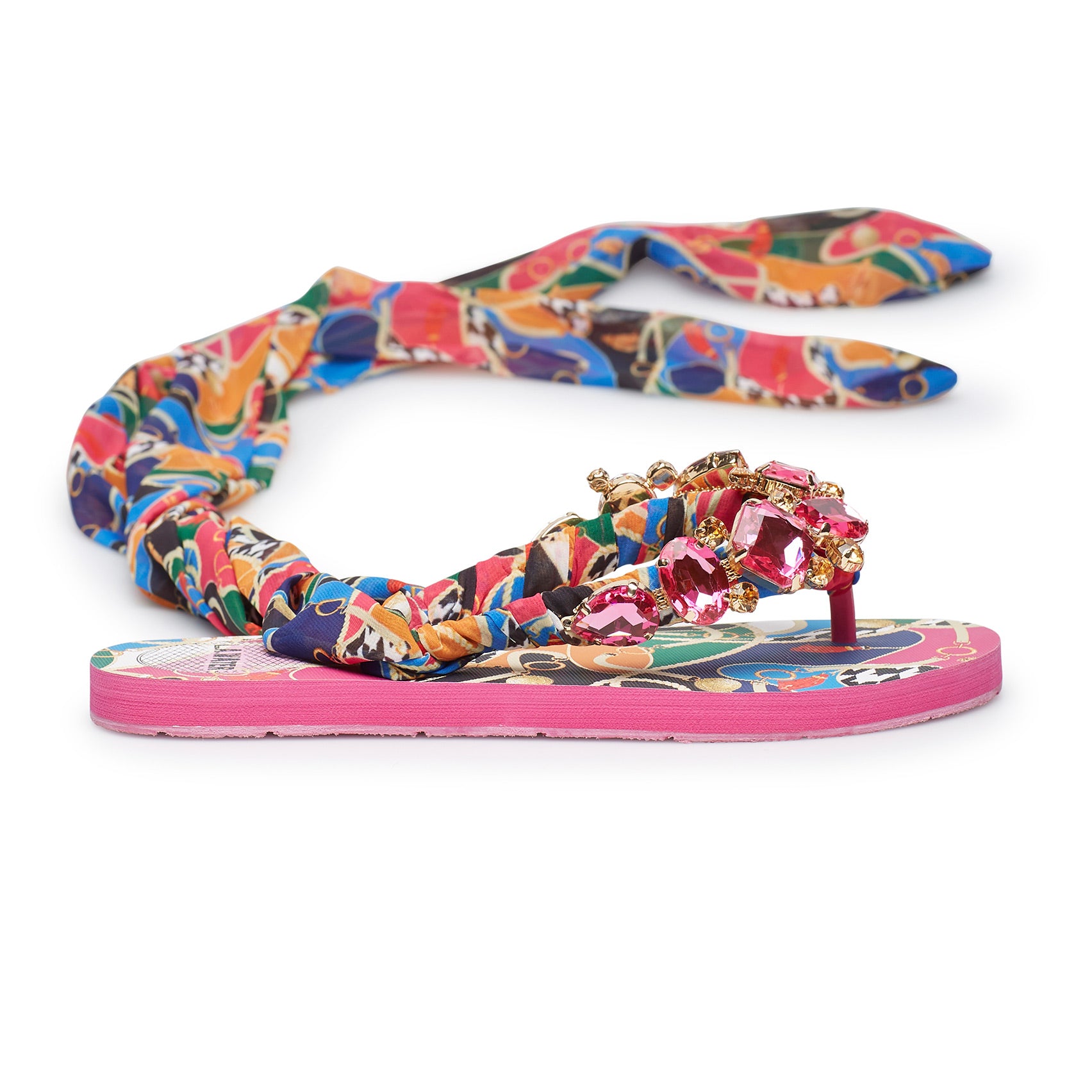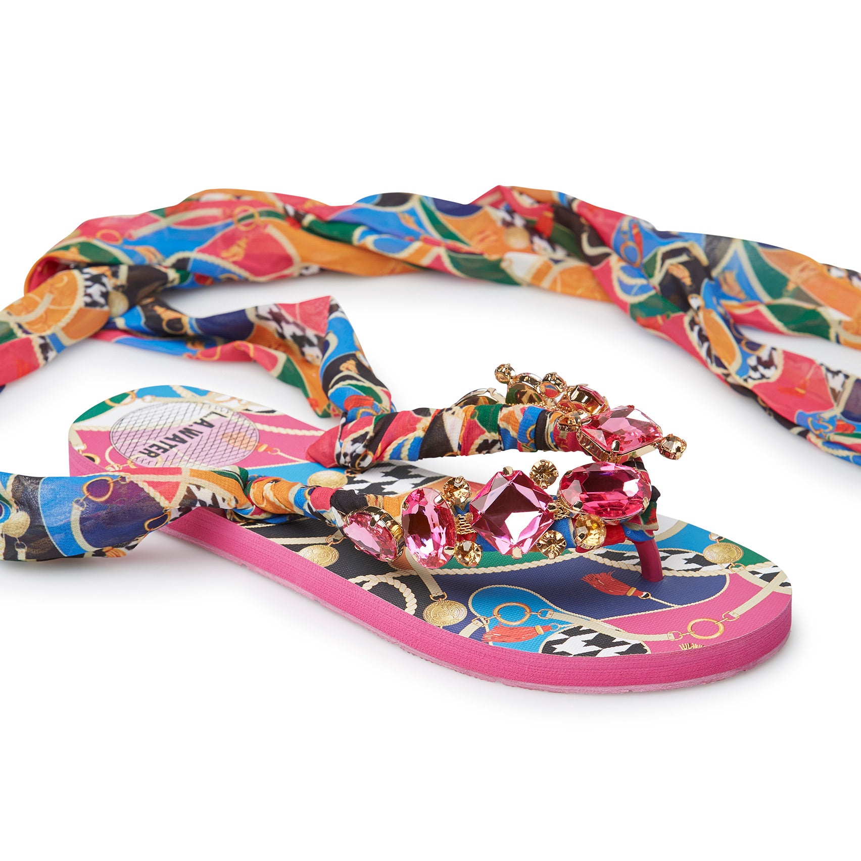 I cinturini sono impreziositi da grandi gemme fucsia e piccole pietre color oro, con un foulard da annodare alla caviglia.