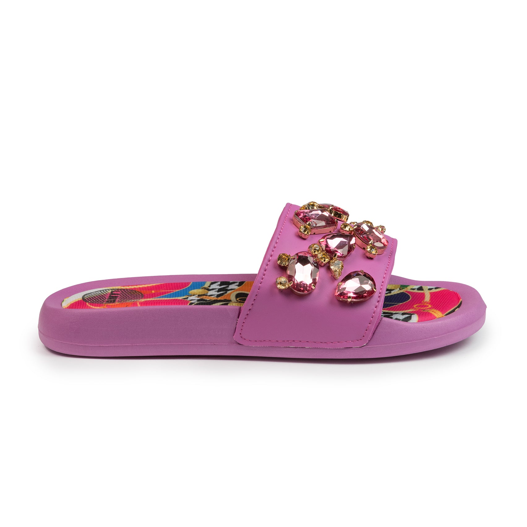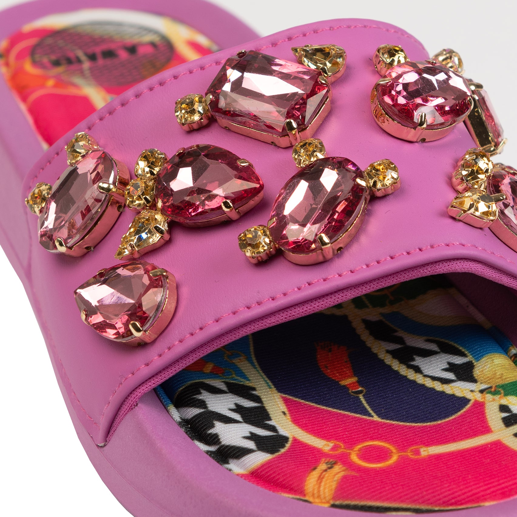 La fascia è splendidamente impreziosita da grandi gemme fucsia e mini pietre dorate.