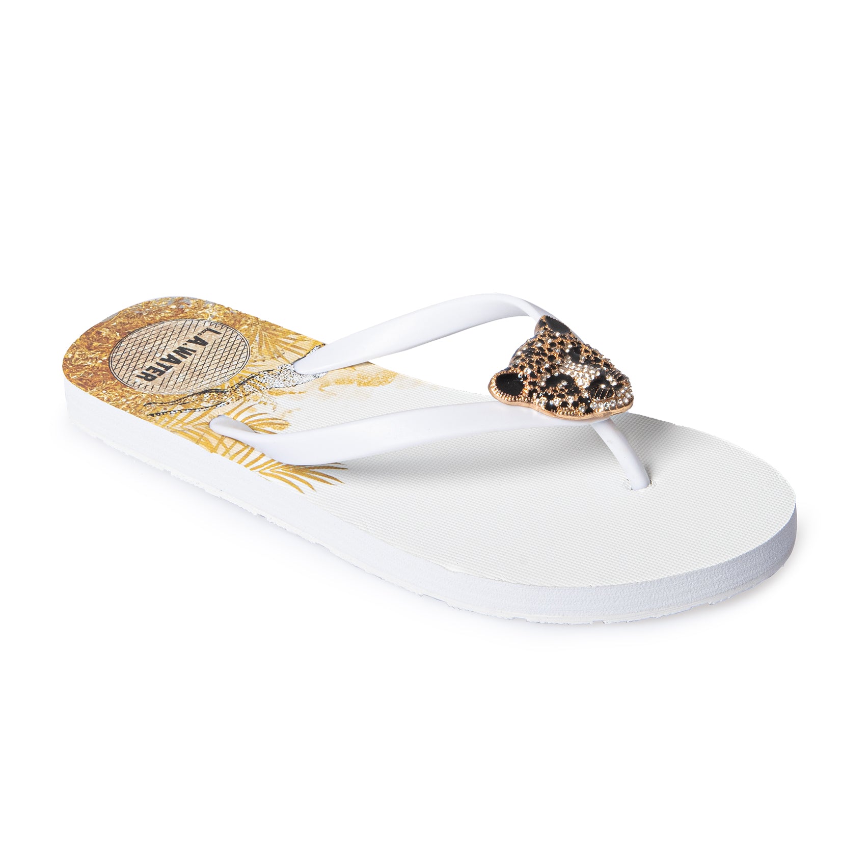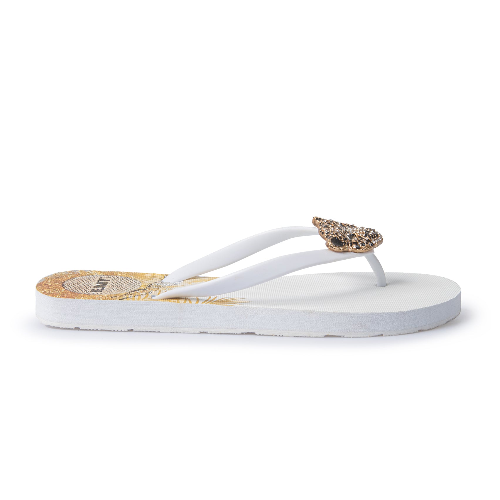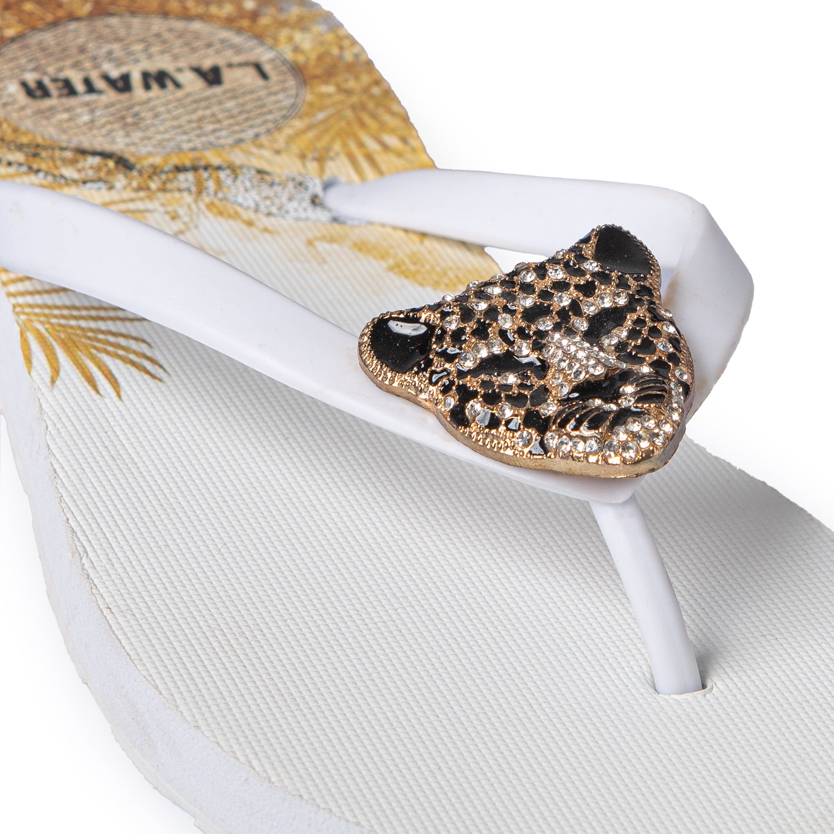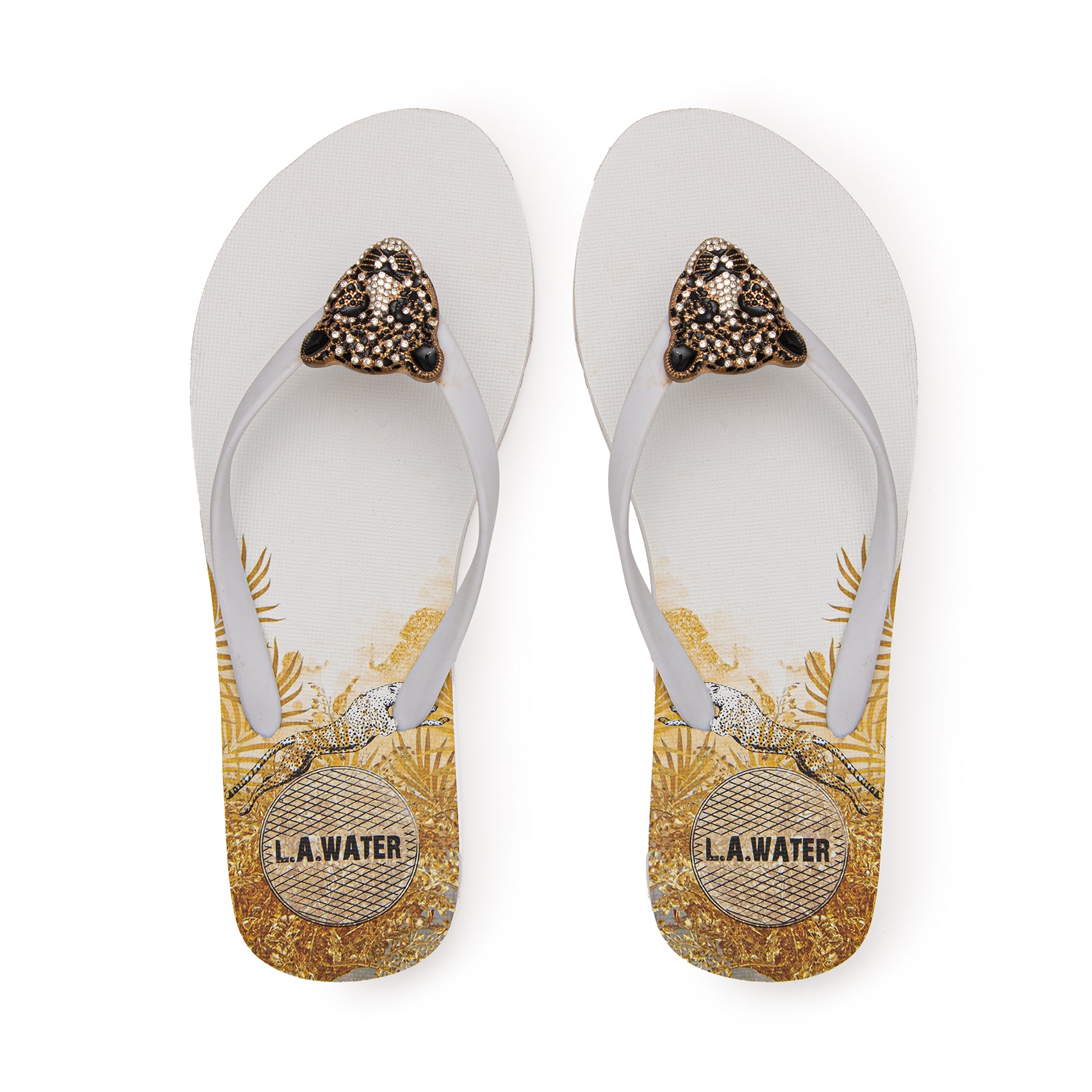 Infradito con stampa tropical nei toni dorati su base bianca, per un look deciso e sofisticato. La tomaia in gomma è impreziosita da un accessorio metallico a forma di testa di ghepardo, decorato con strass neri: un dettaglio grintoso che dona carattere e luminosità alla calzatura.