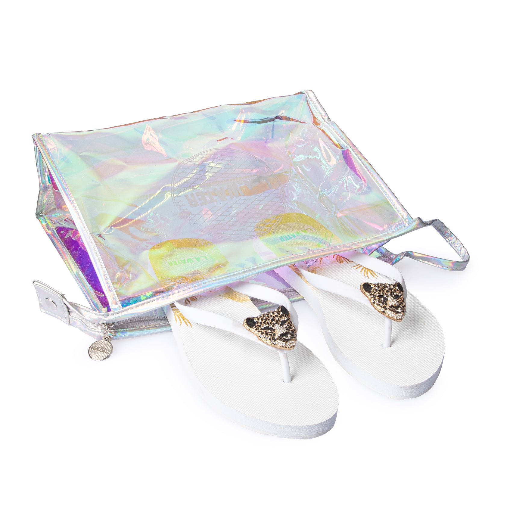 Packaging: Confezionato nella comoda pochette in PVC opaco con logo L.A. WATER, riutilizzabile come glam bag per il mare o per la città.