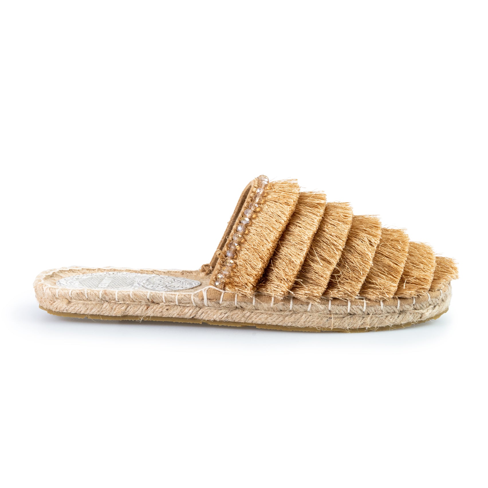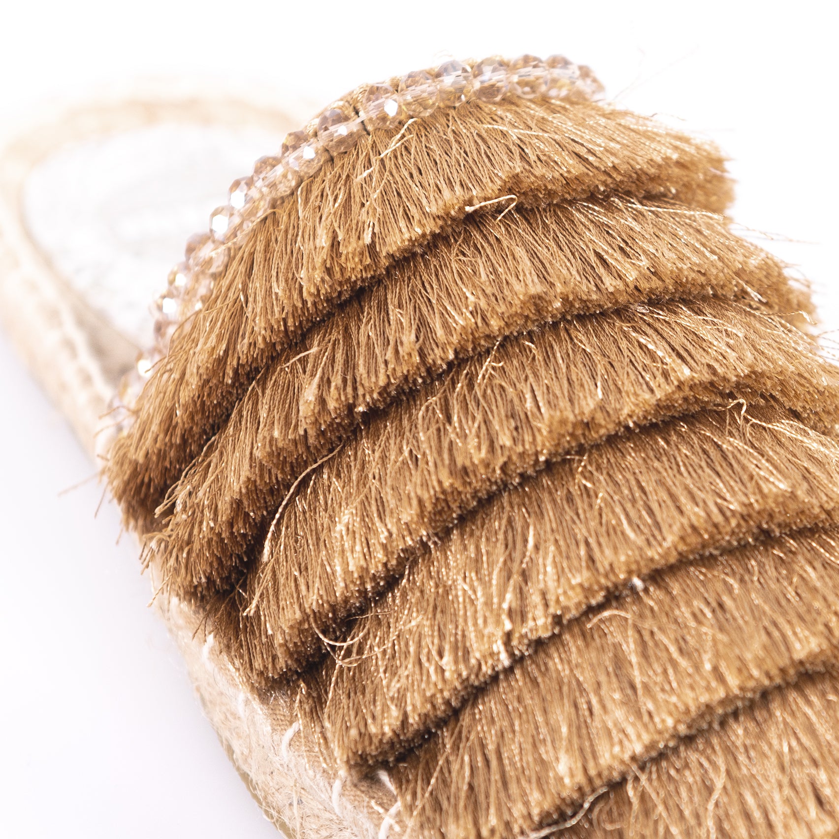 Sandali in corda con frange color sabbia e collana di perline luminose abbinata.