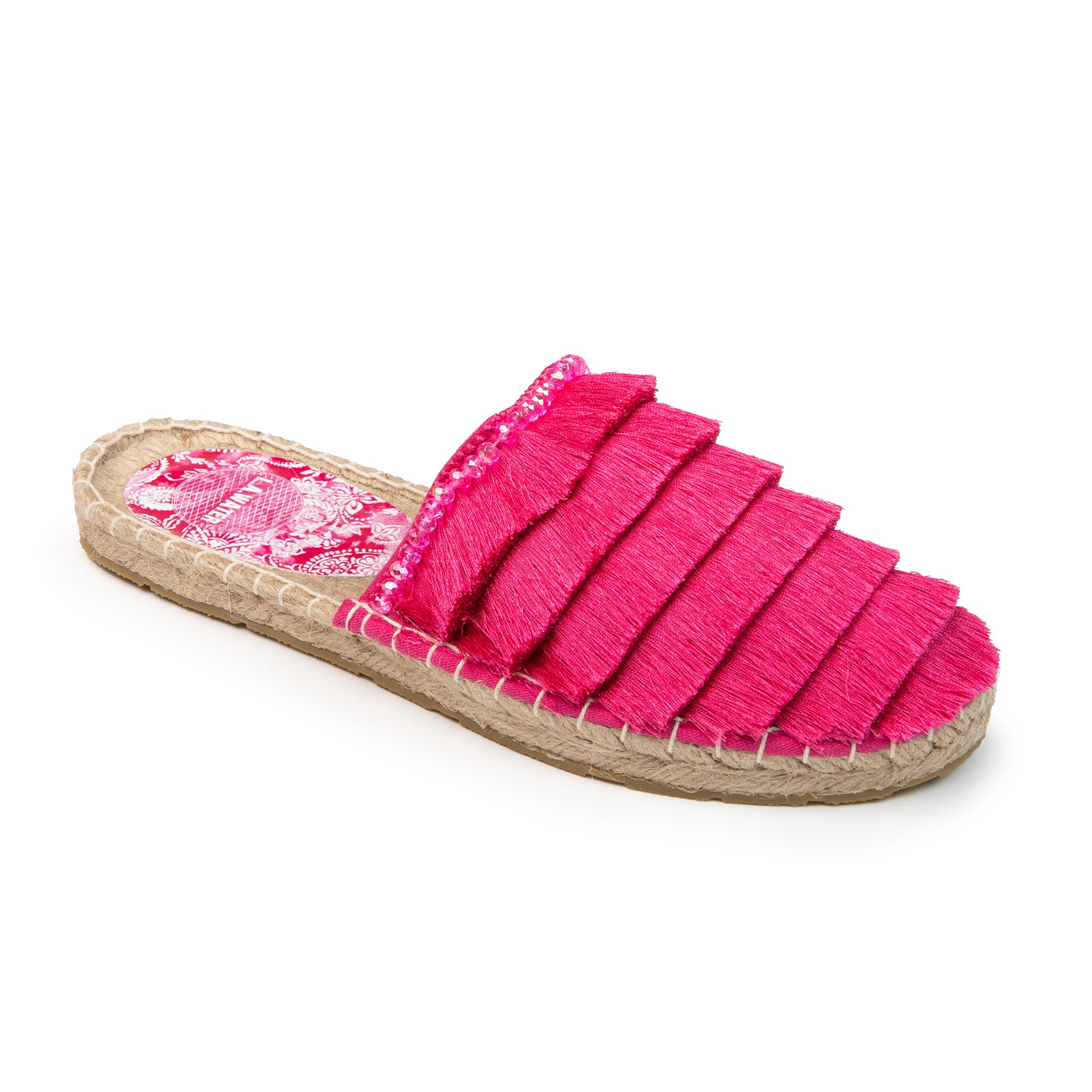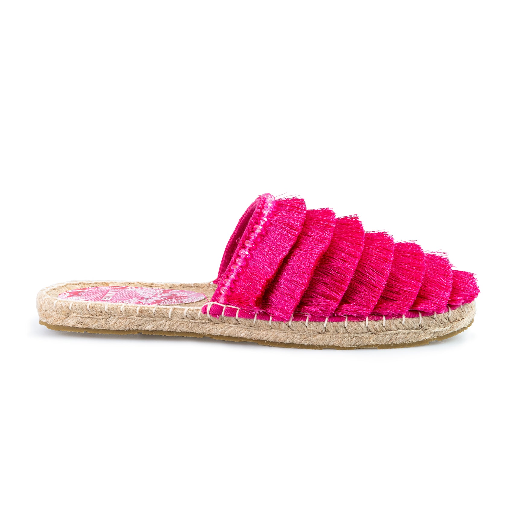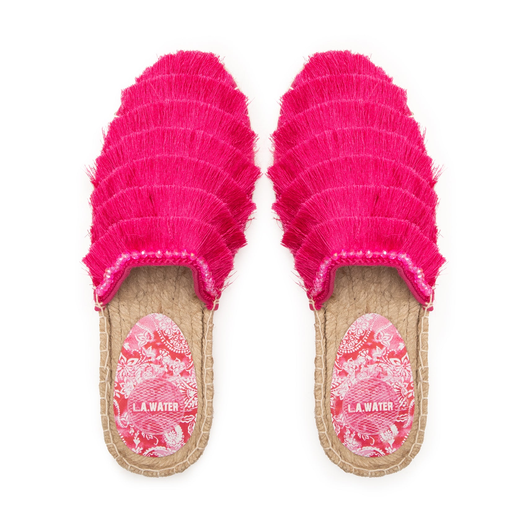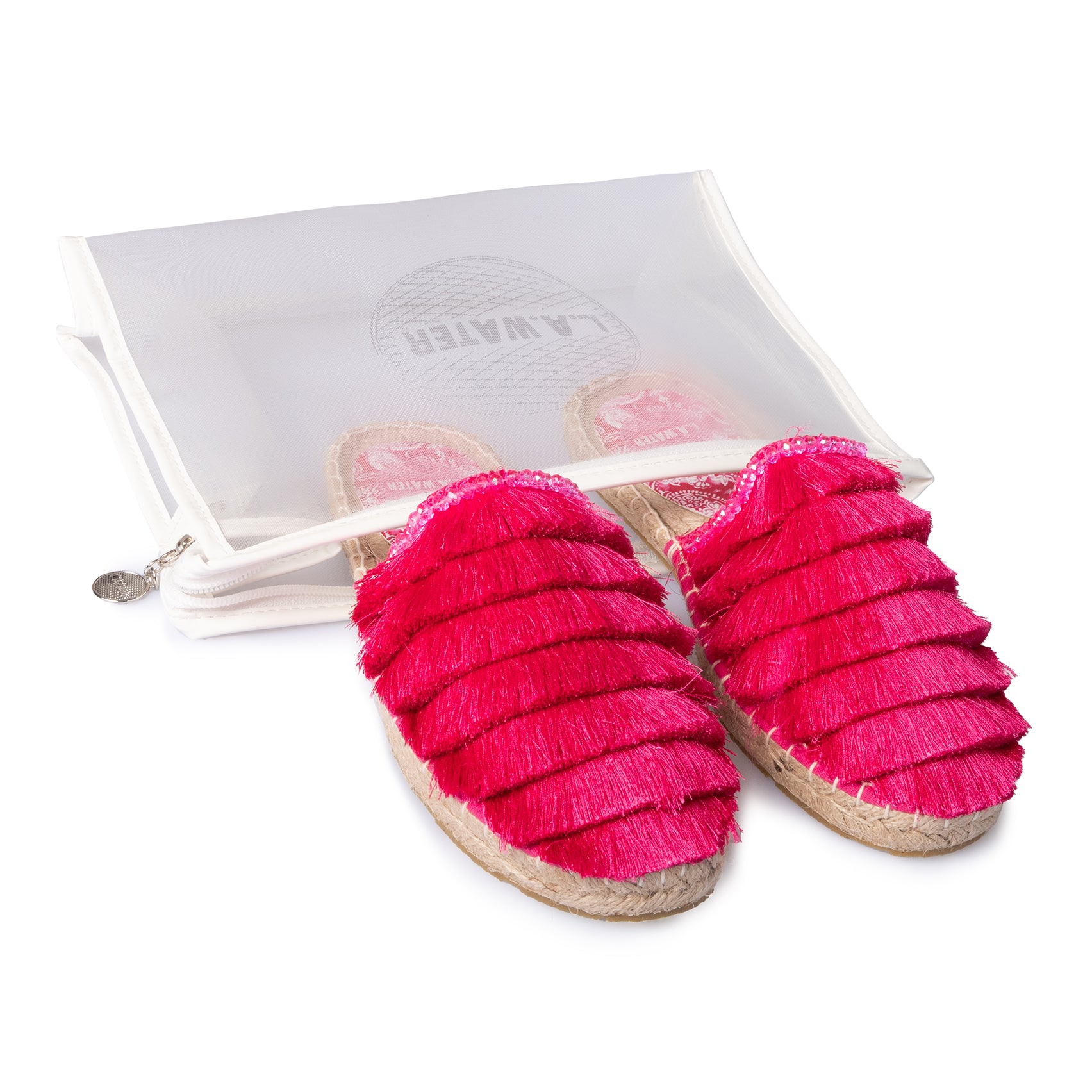 Sabot in corda con frange fucsia e collana di perline luminose abbinata.