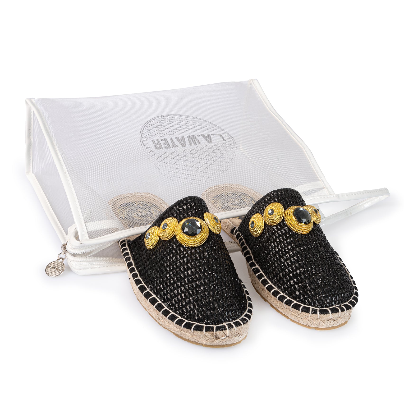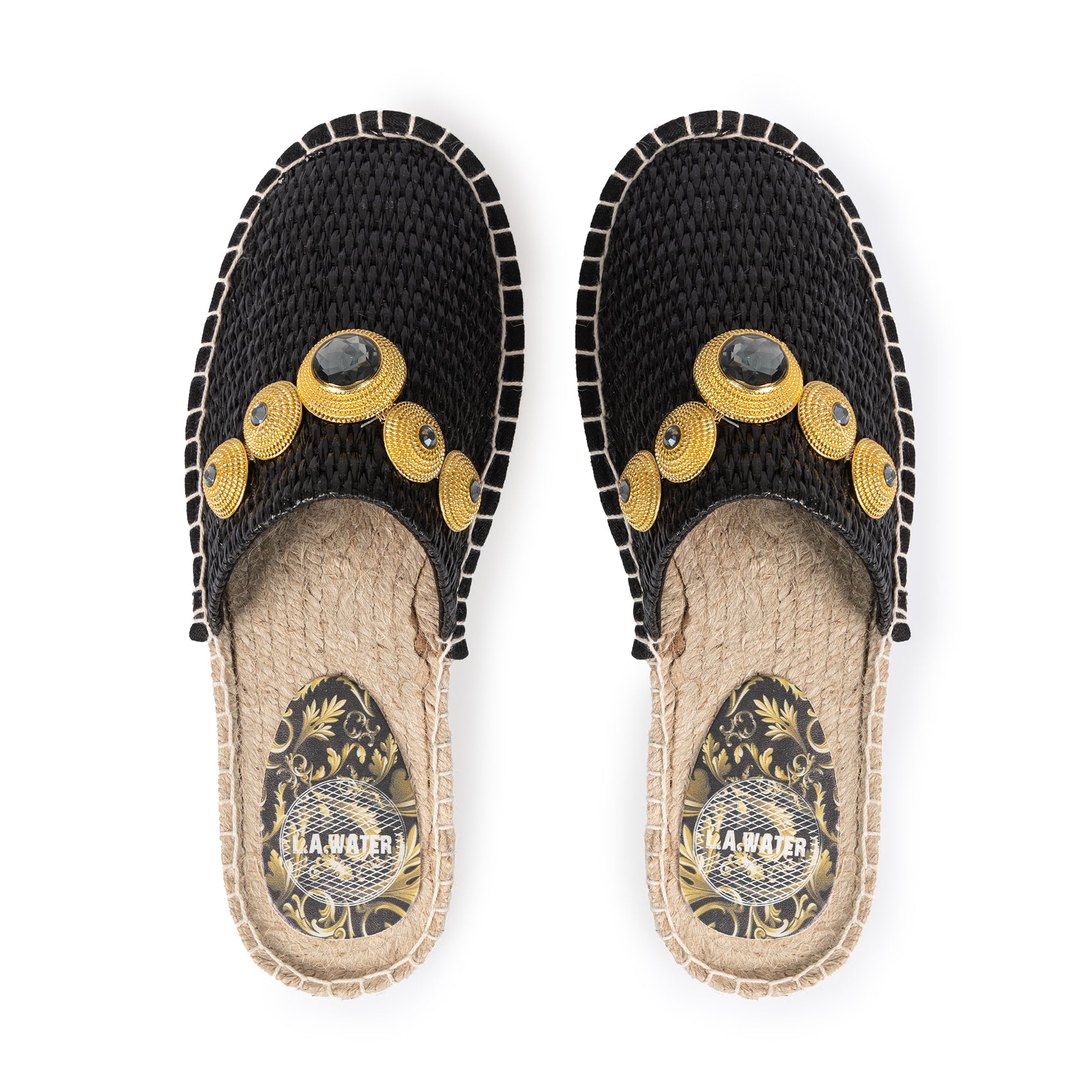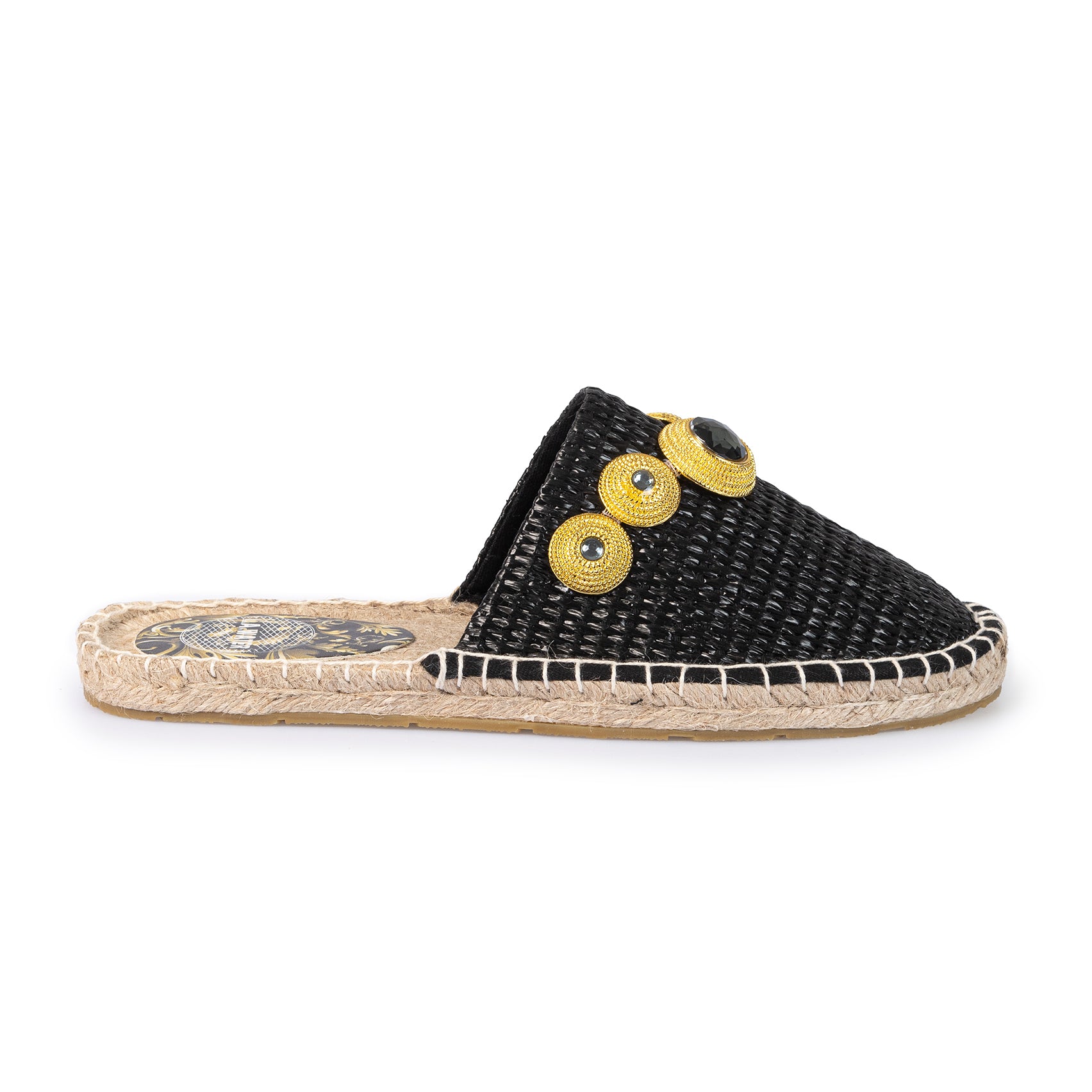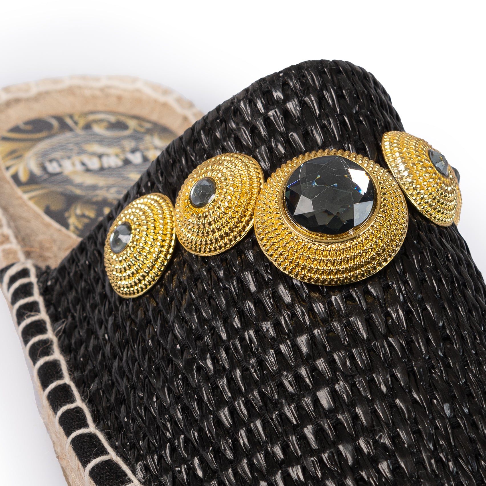 Mules in corda con tomaia in rafia nera accessoriata da bottoni gioiello oro e pietre fumè.