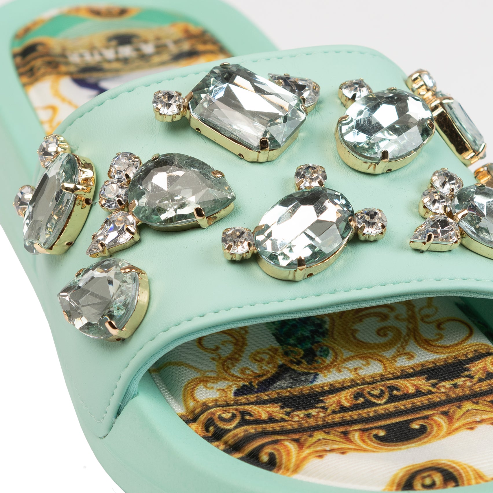 La fascia è splendidamente impreziosita da grandi gemme color acquamarina e mini cristalli.