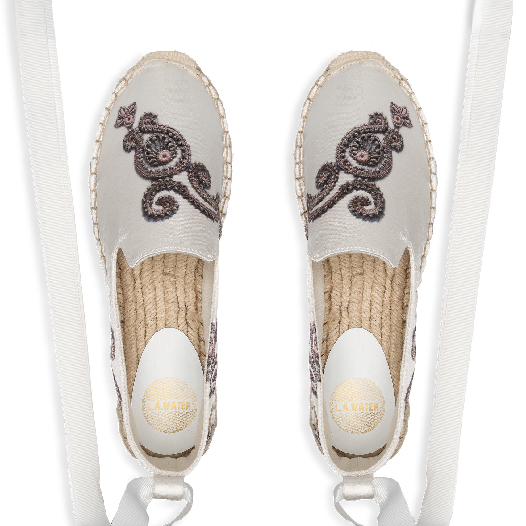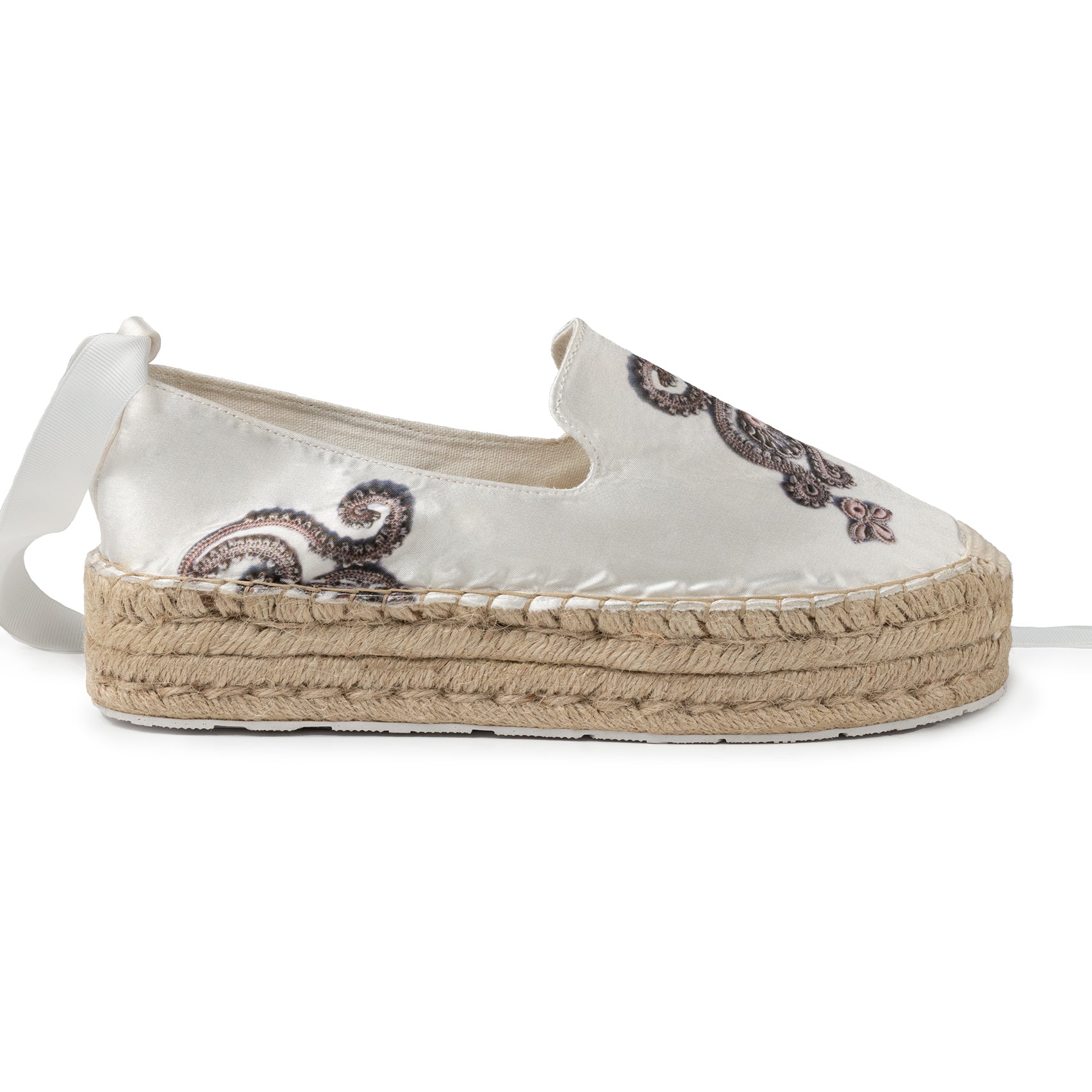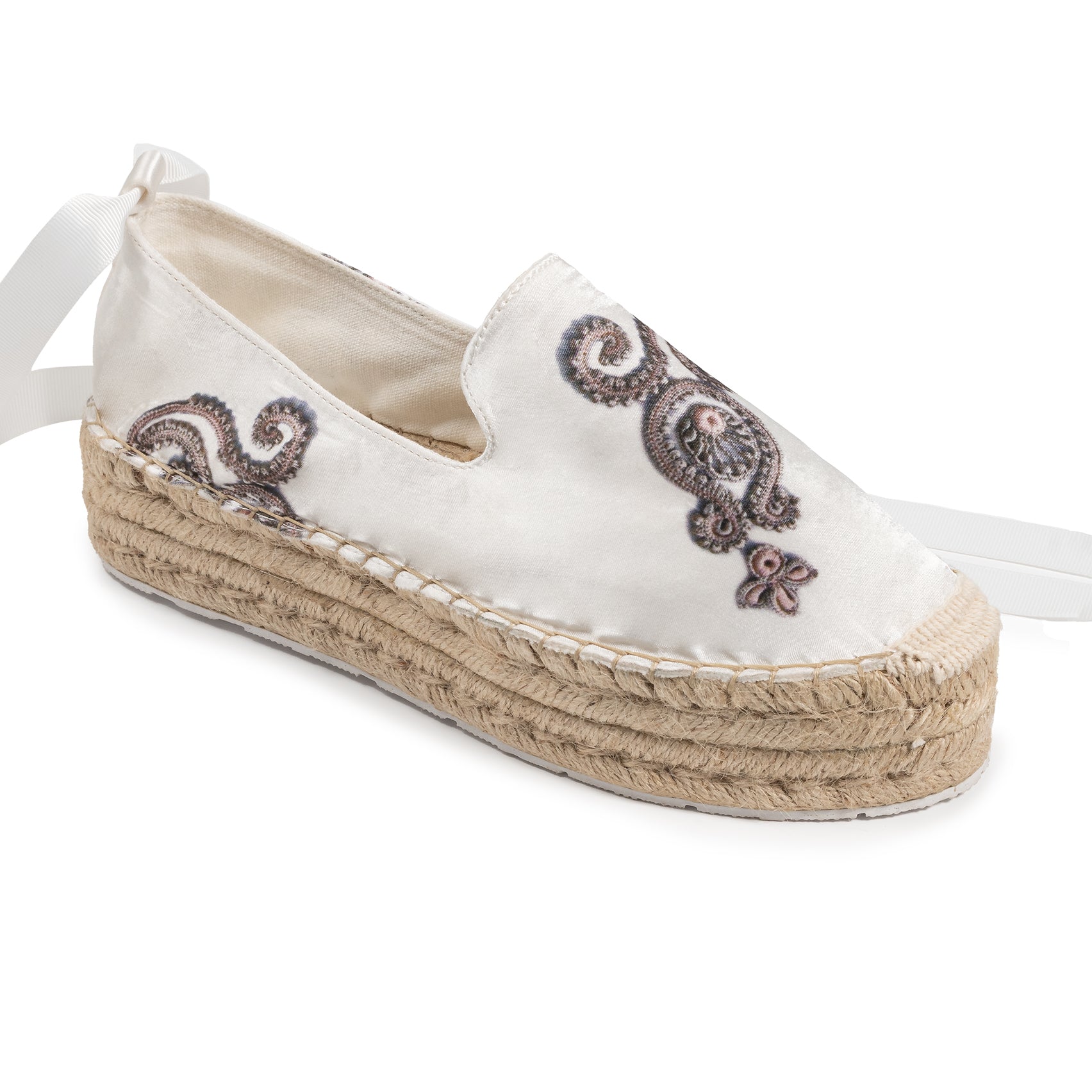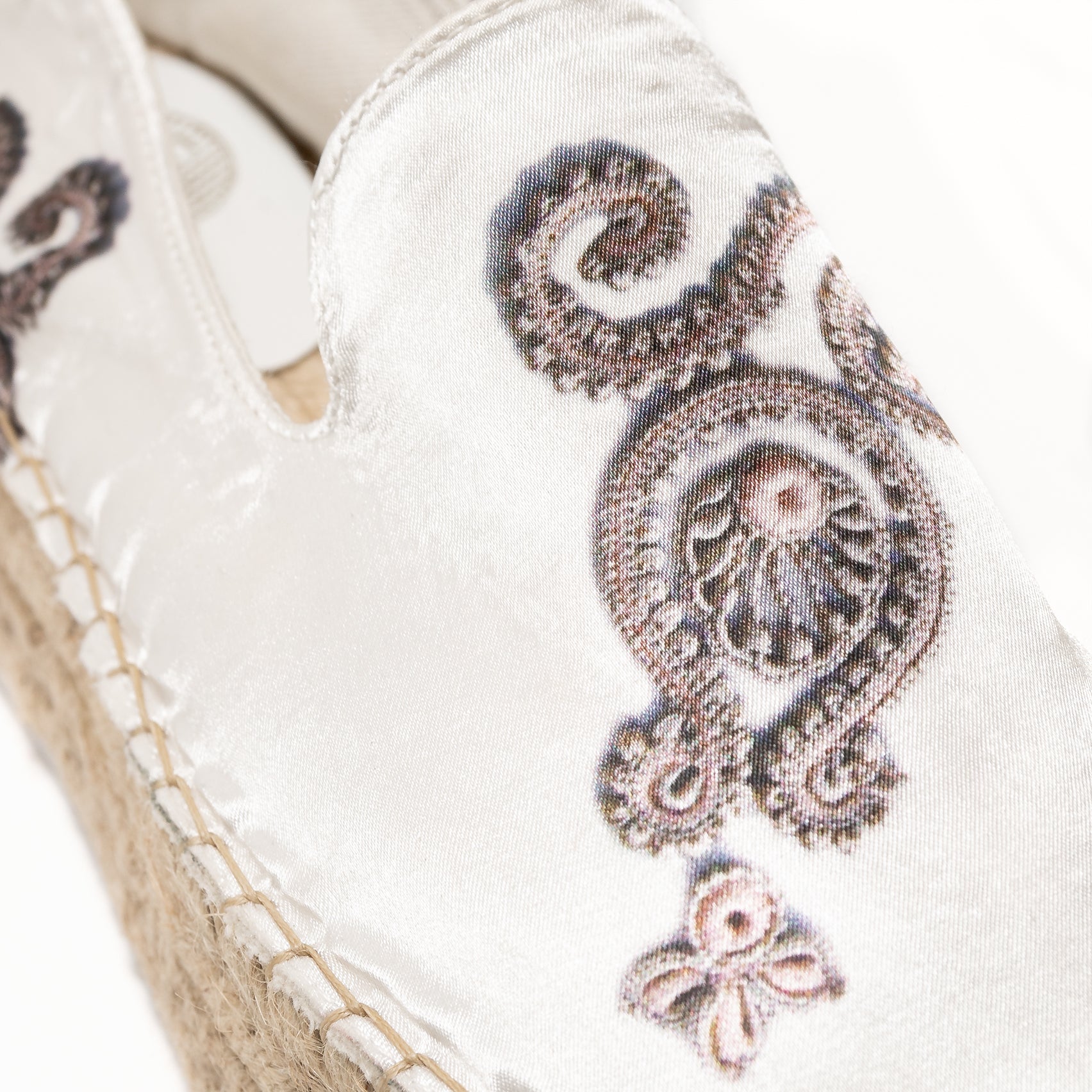 Espadrillas con suola in corda naturale e tomaia in raso bianco stampato, d’ispirazione Paisley.