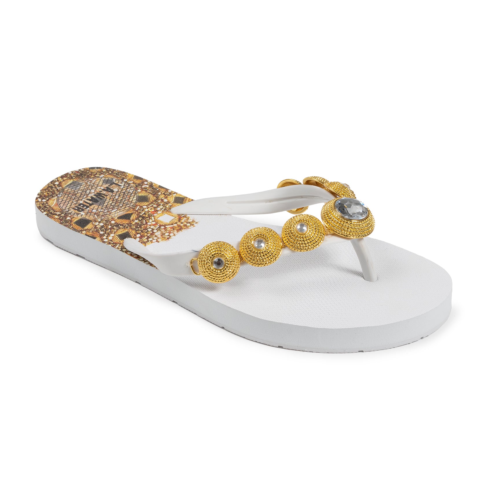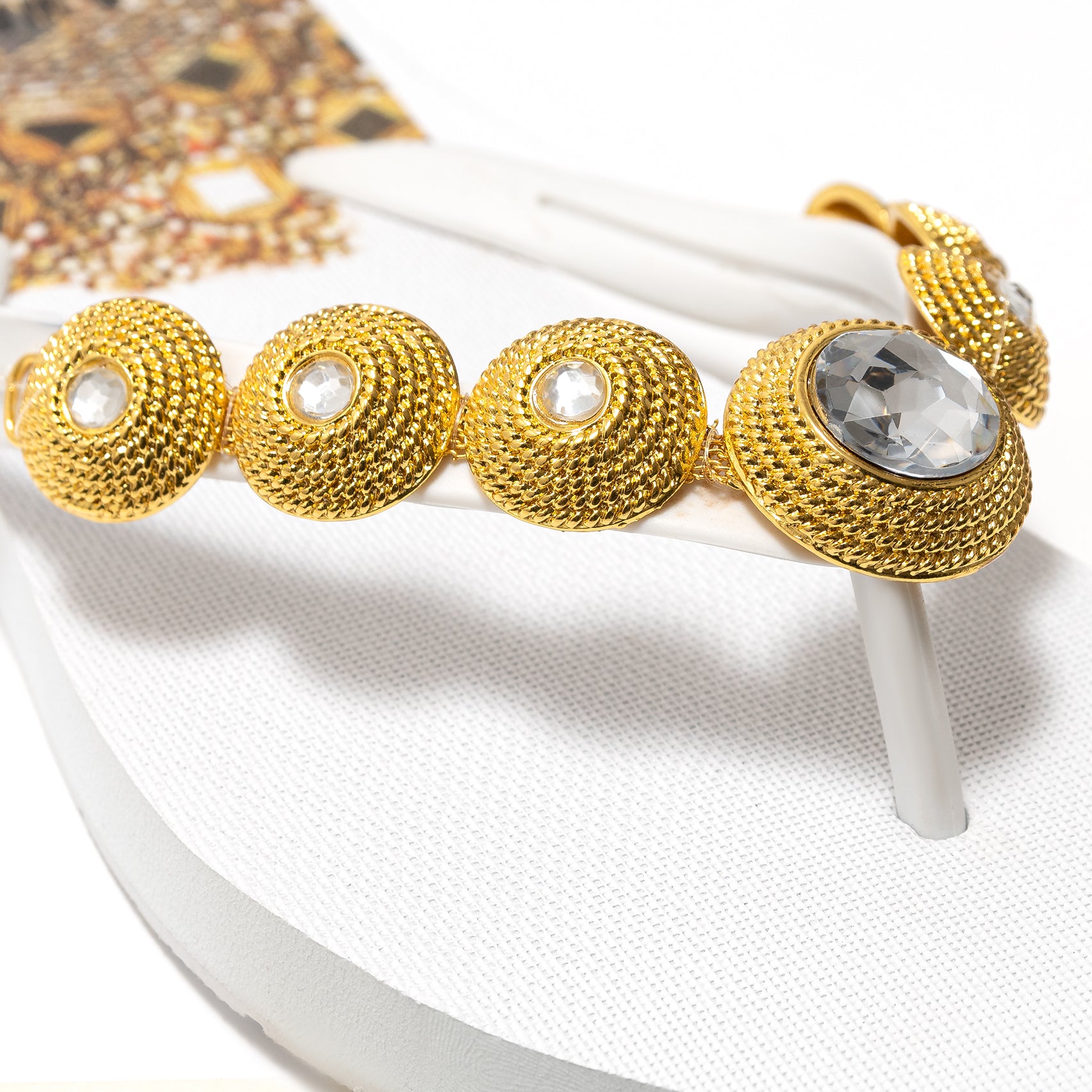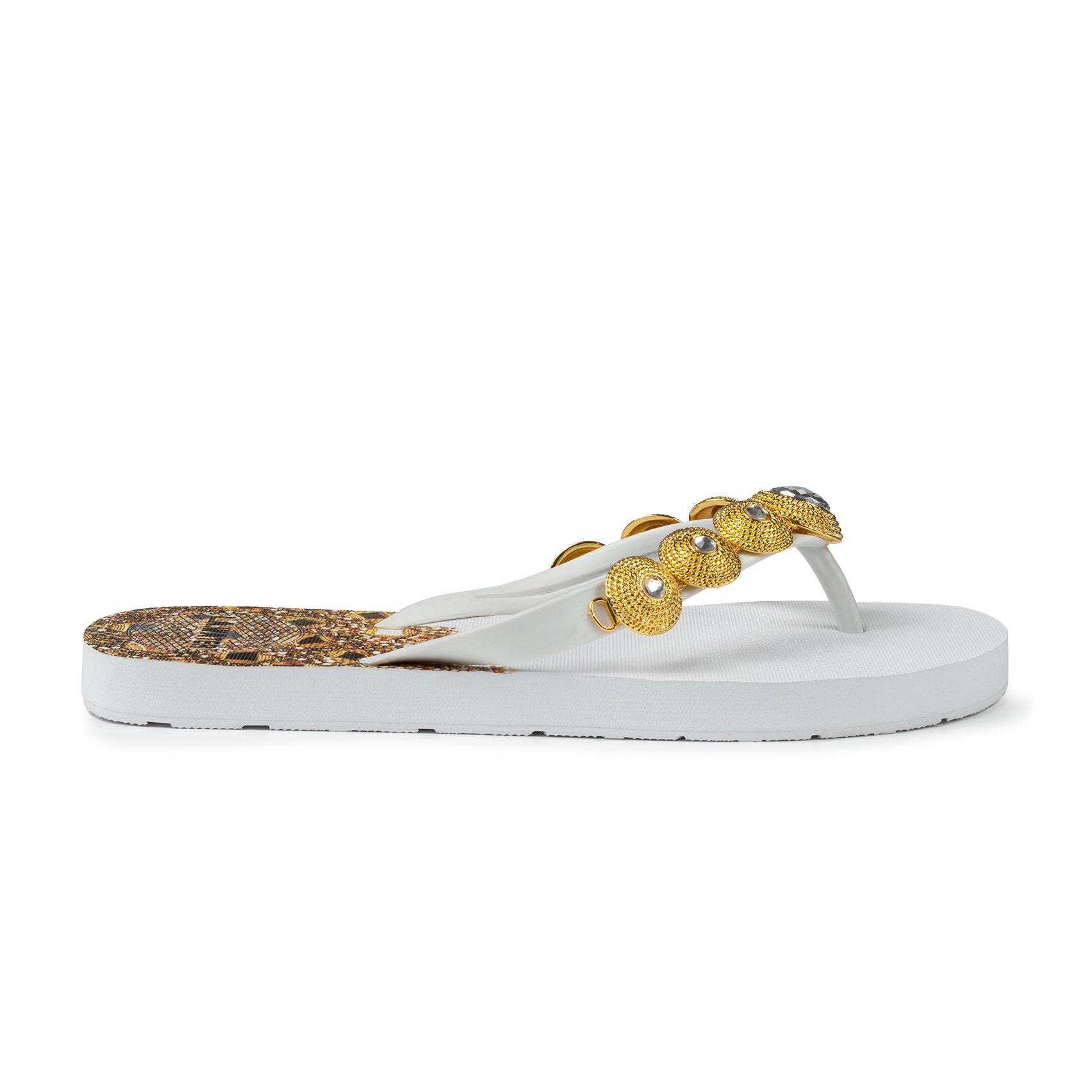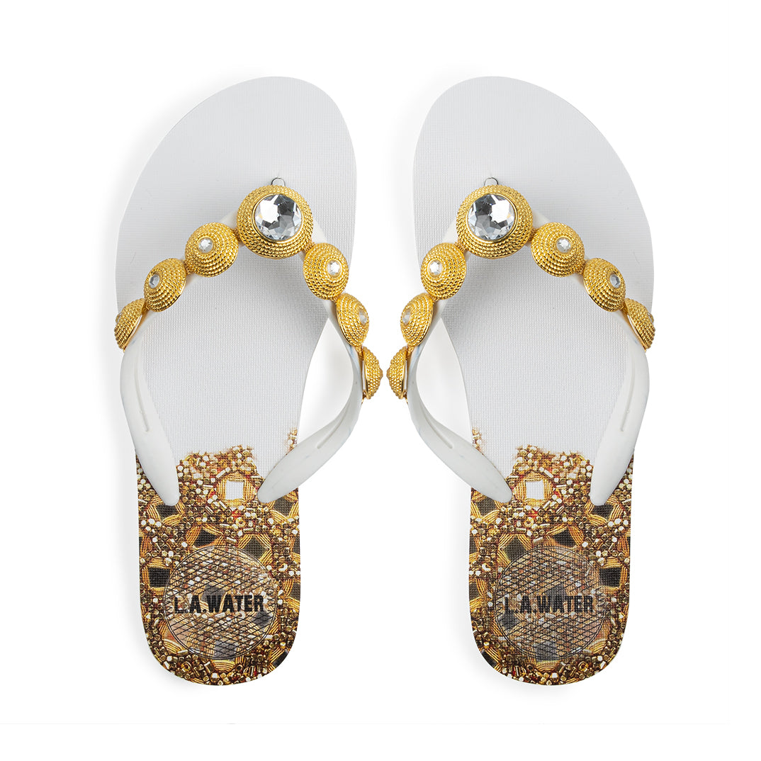 Sandalo infradito con pattern ispirato all’arte bizantina dei mosaici con base bianca e decori oro.