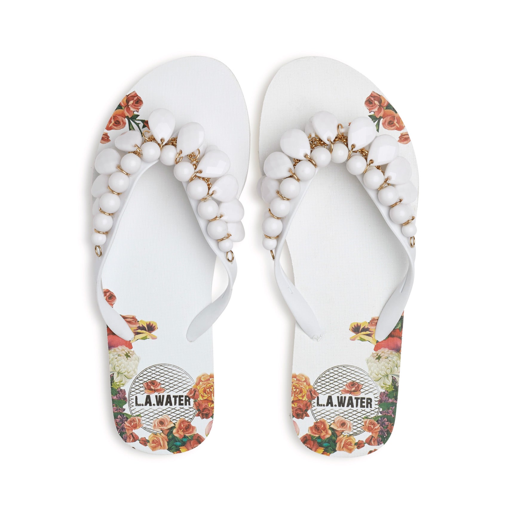 Ciabatte dal design esclusivo ispirate ai fiori tropicali in tonalità bianco, fucsia e arancione.