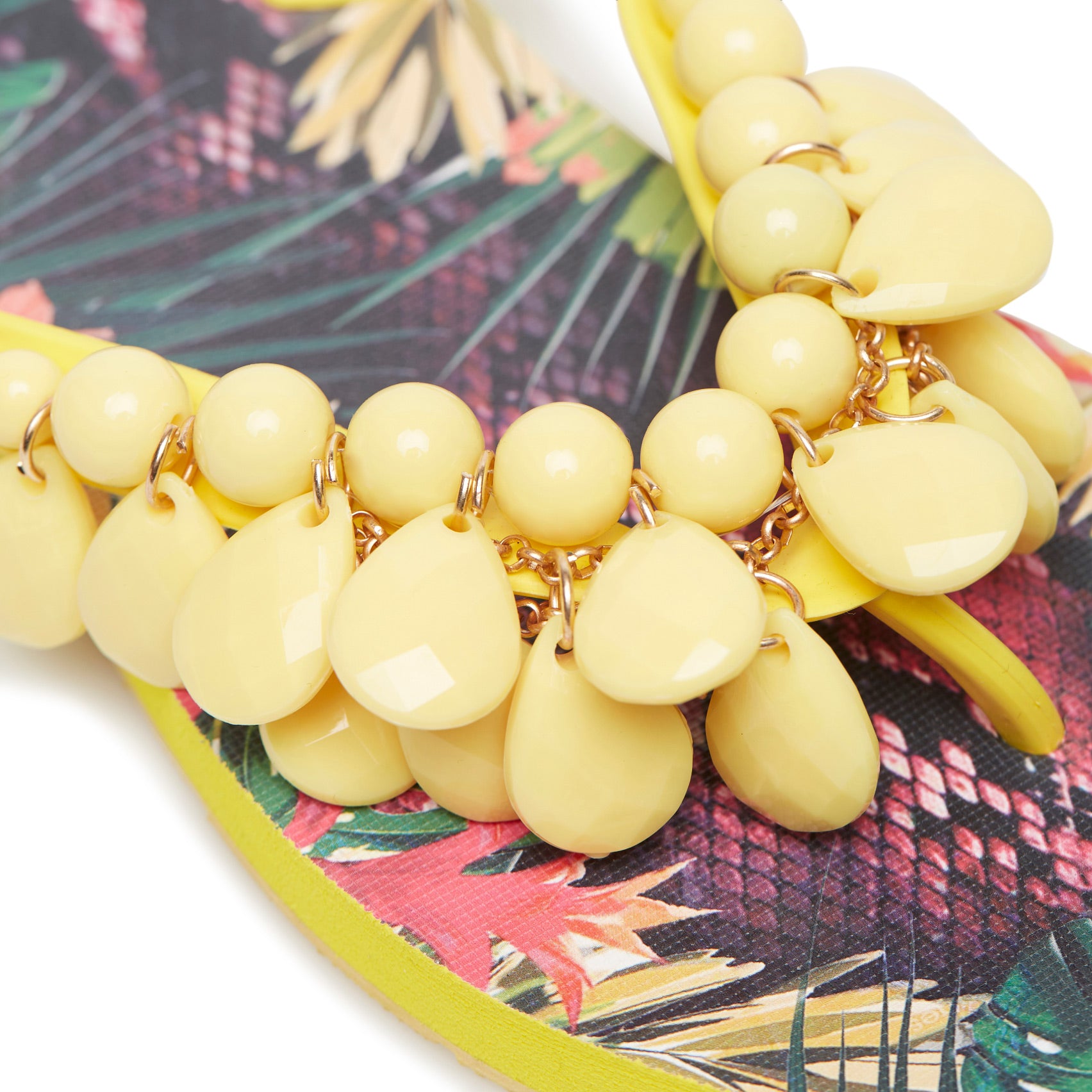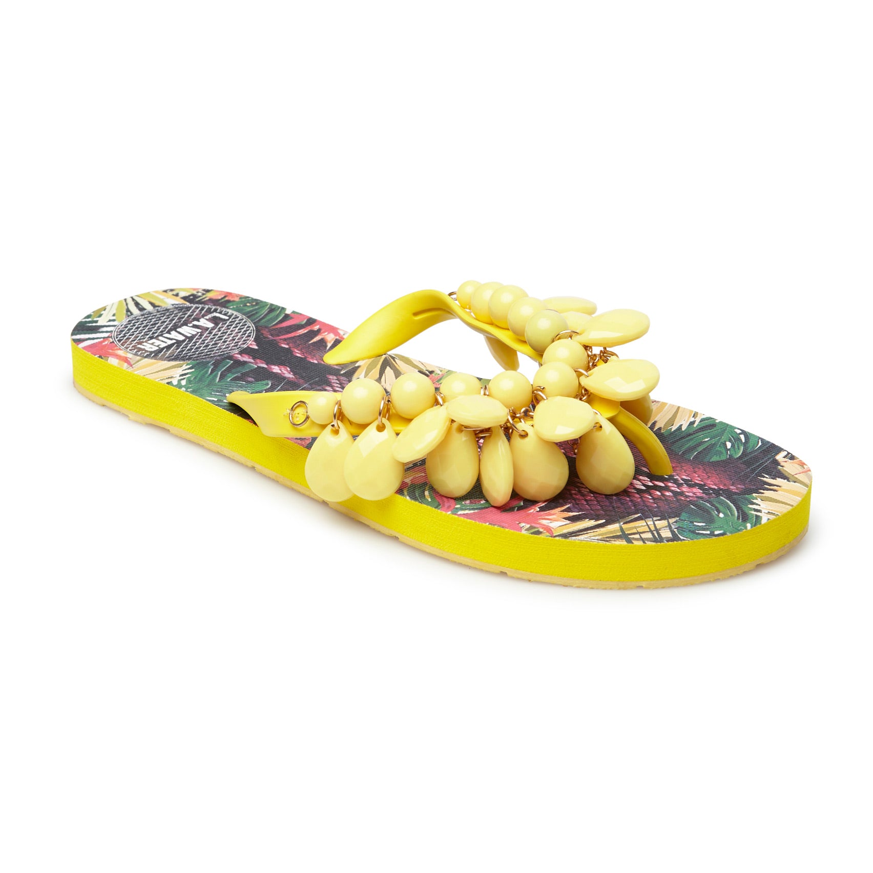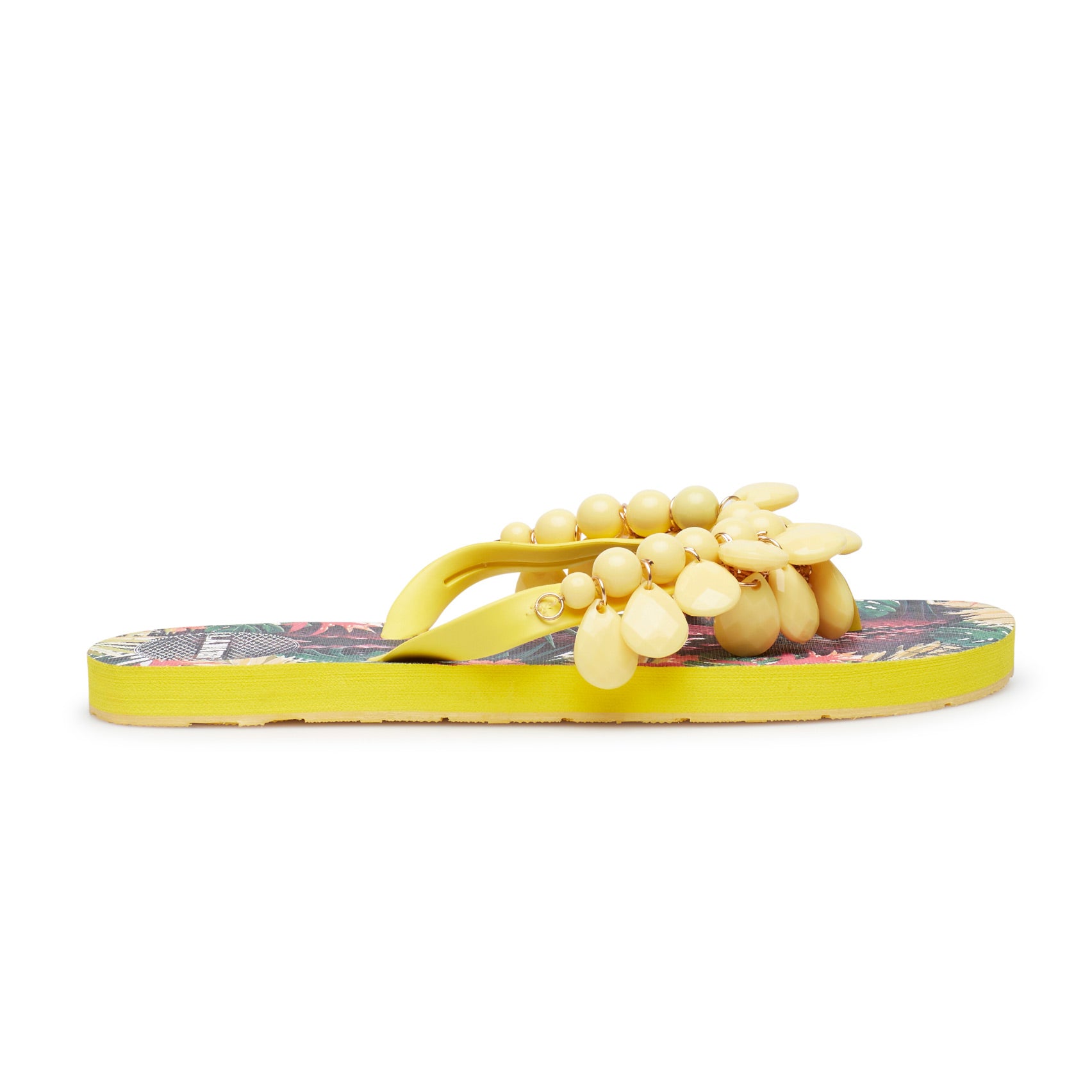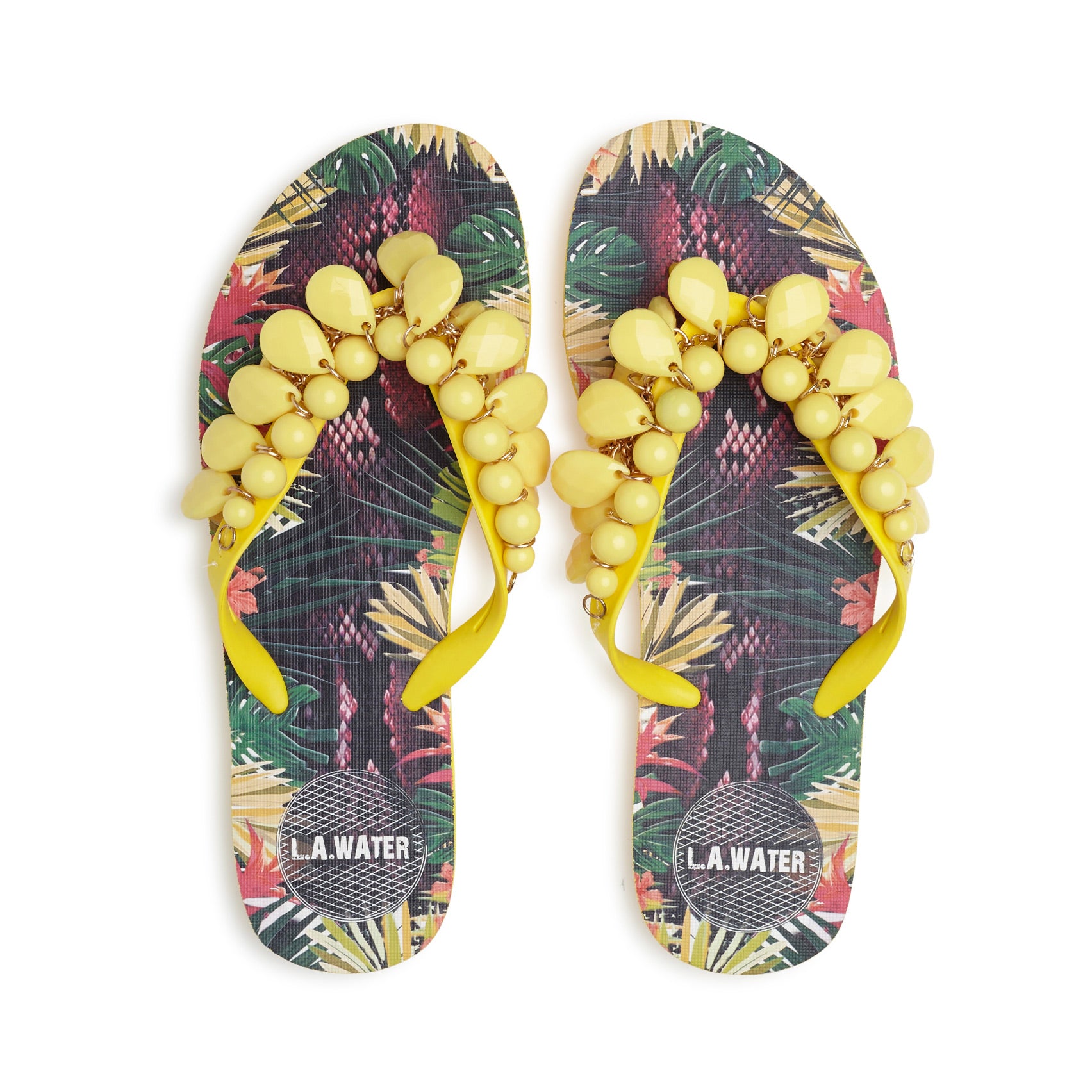 Ciabatte dal design esclusivo ispirate ai fiori tropicali in tonalità verde acceso, giallo e fucsia.