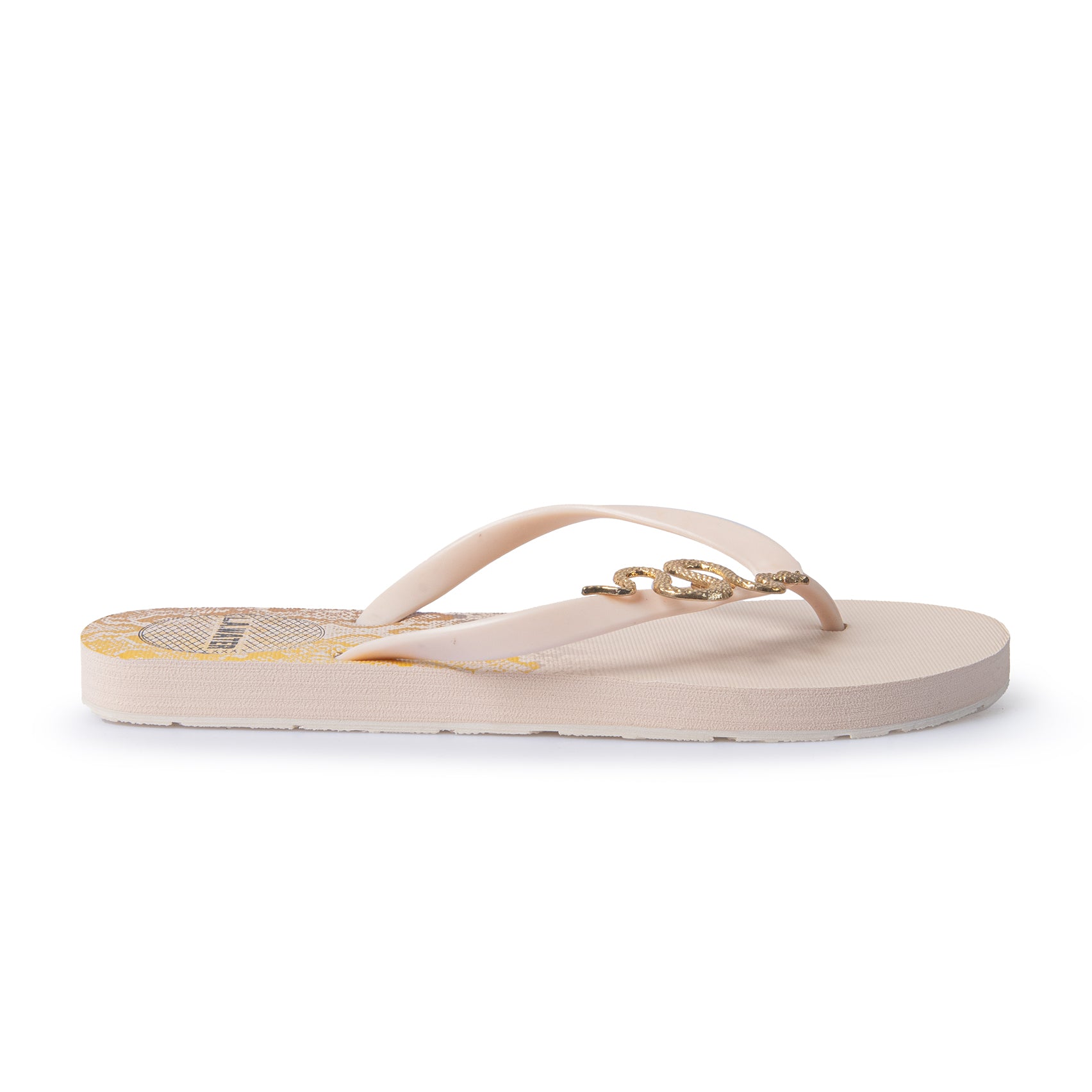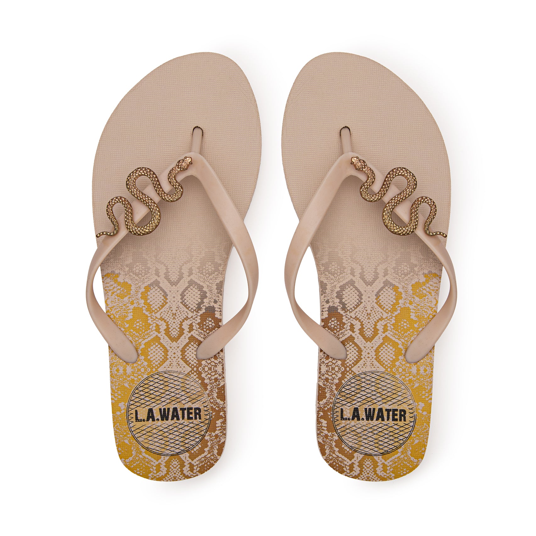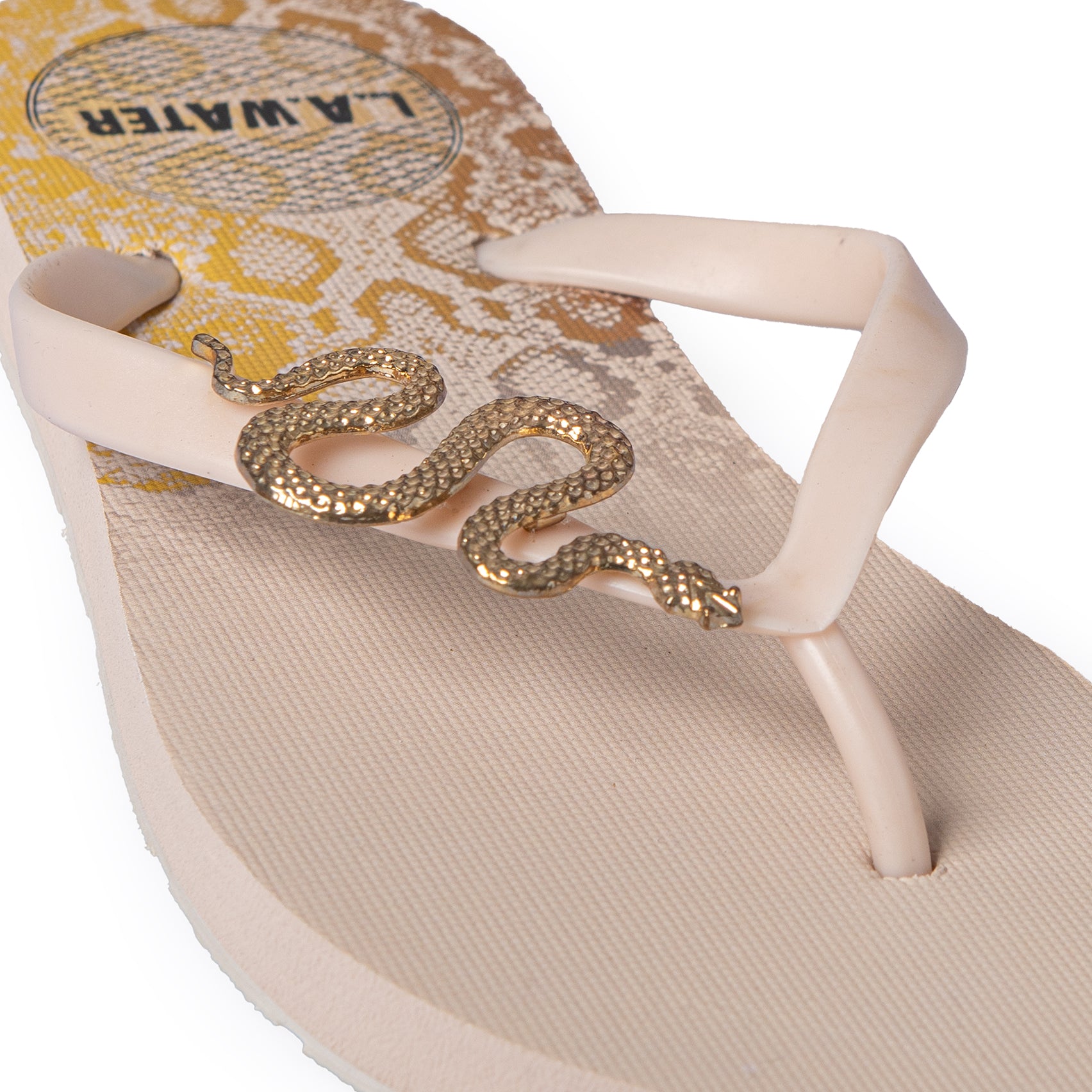 Infradito flat con suola nude soft touch, elegante e delicata, impreziosita da una stampa effetto pitone nei toni dell’oro e dell’ocra. Accessorio gioiello a forma di serpente dorato sulla tomaia in gomma, montato a mano e arricchito da micro-strass, per un effetto brillante e sofisticato che richiama la forza e il fascino della natura esotica.