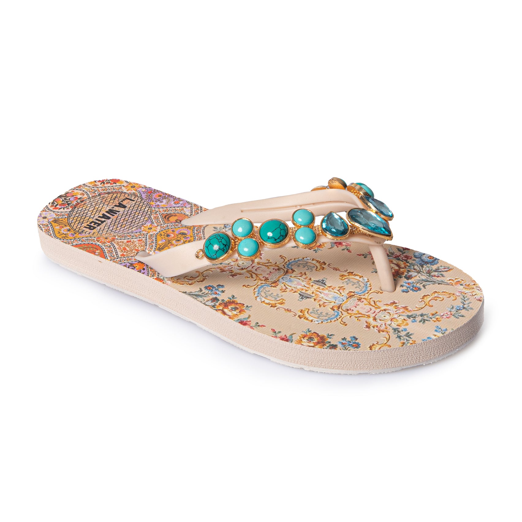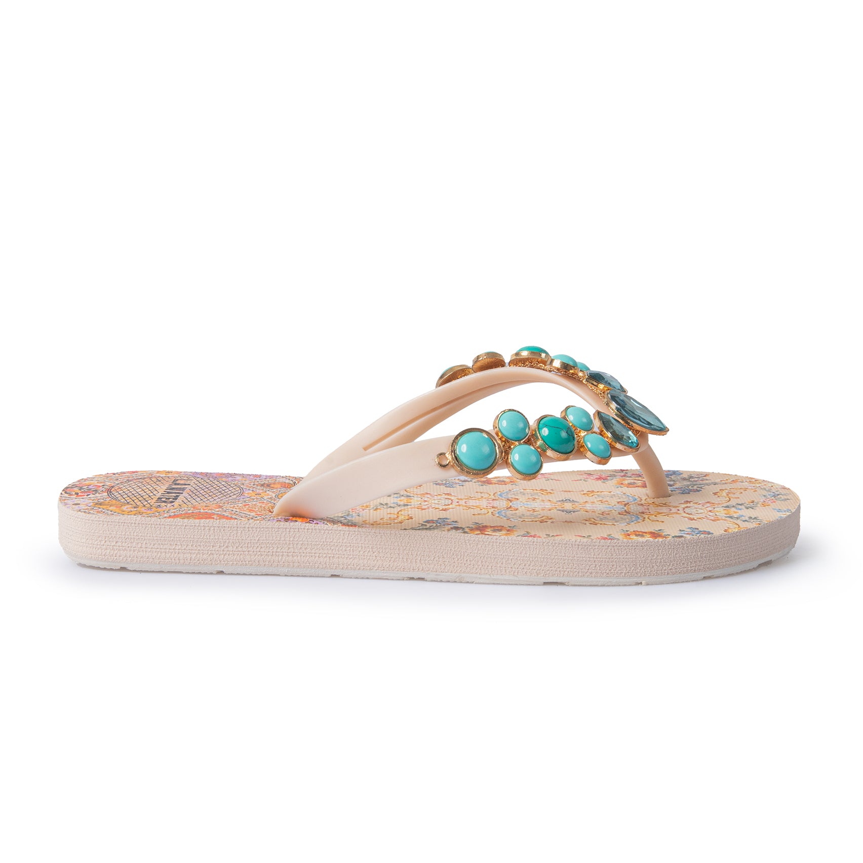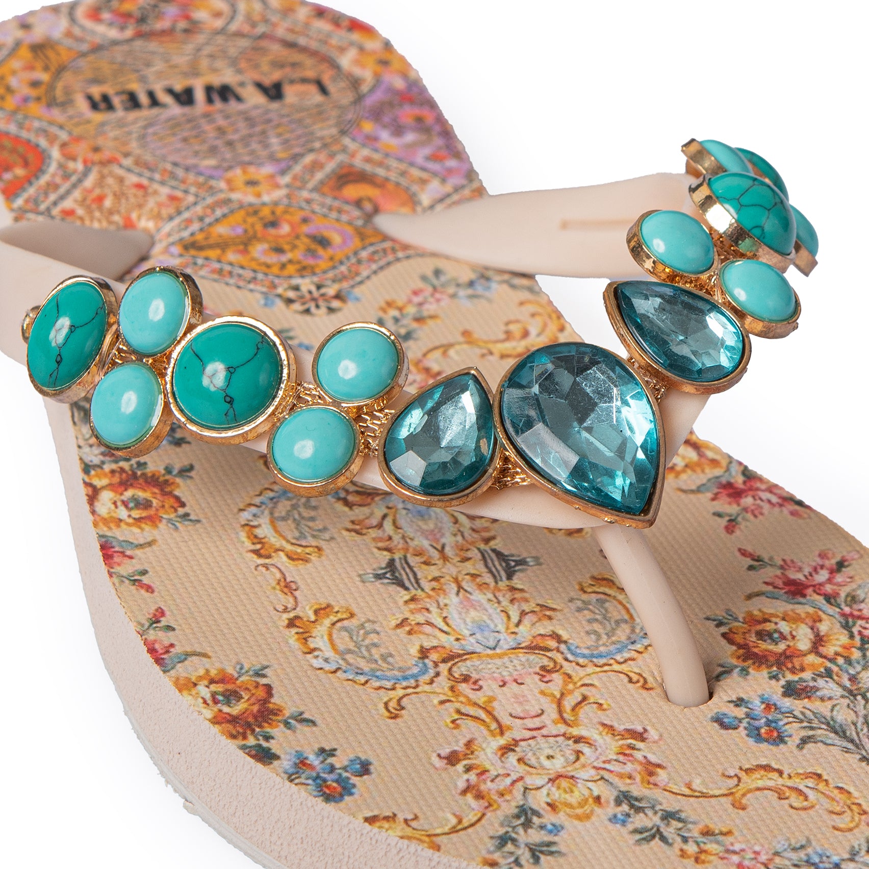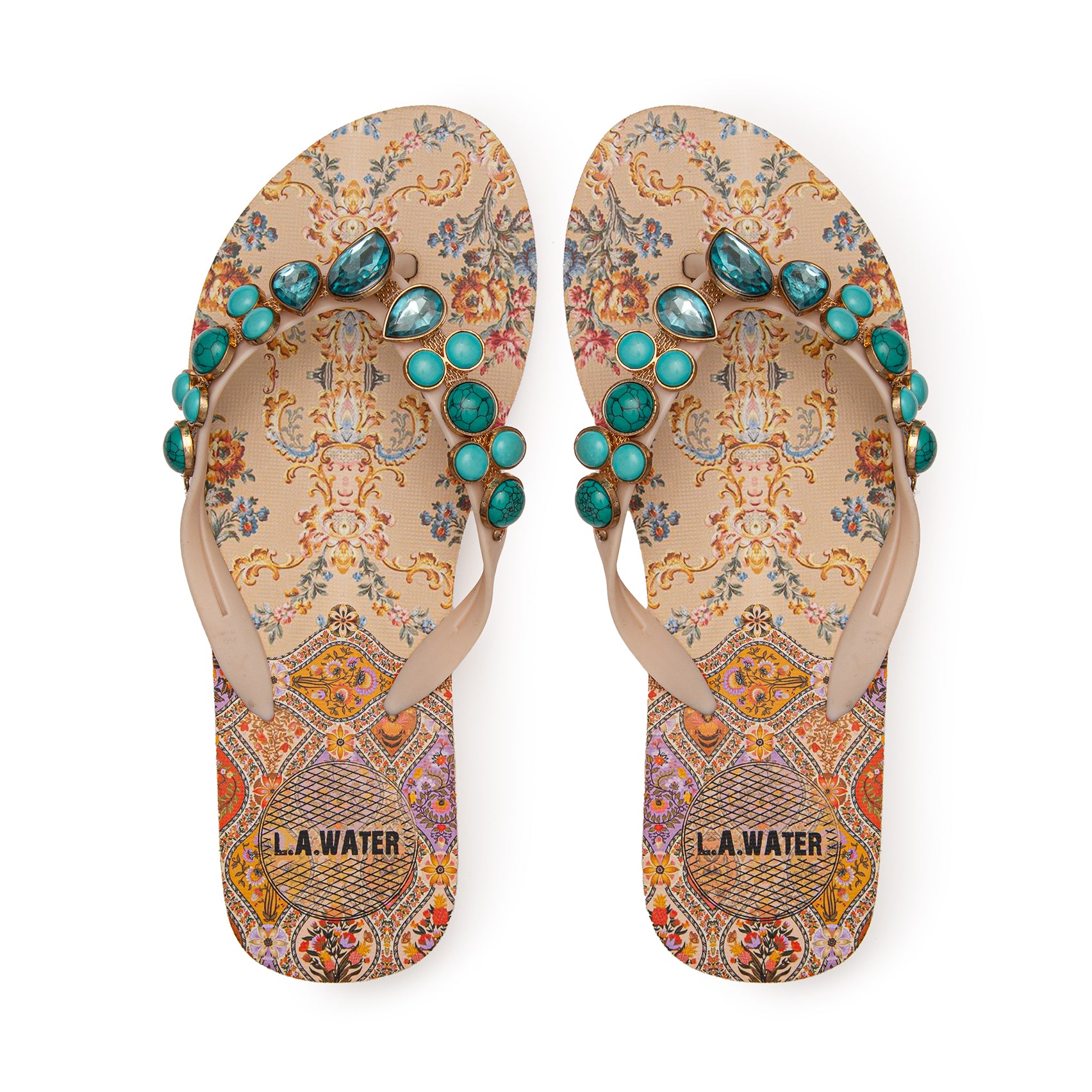 Sandalo infradito con stampa paisley floreale nei toni del nude, ispirata alla freschezza dell’estate mediterranea, un inno alla libertà. La tomaia in gomma bianca è impreziosita da un elegante accessorio in pietre dure turchesi, montato a mano, che dona luce e carattere alla calzatura.