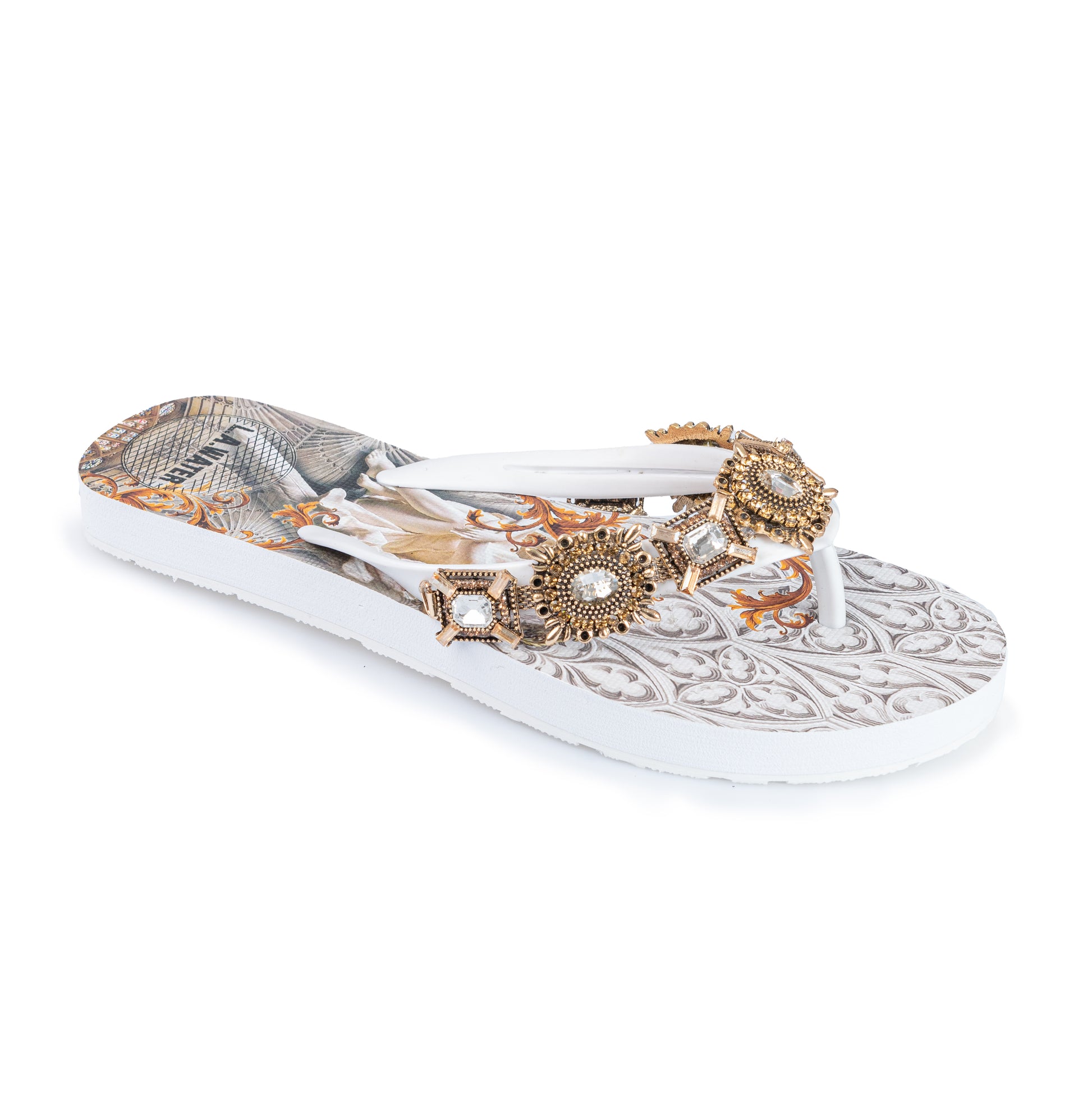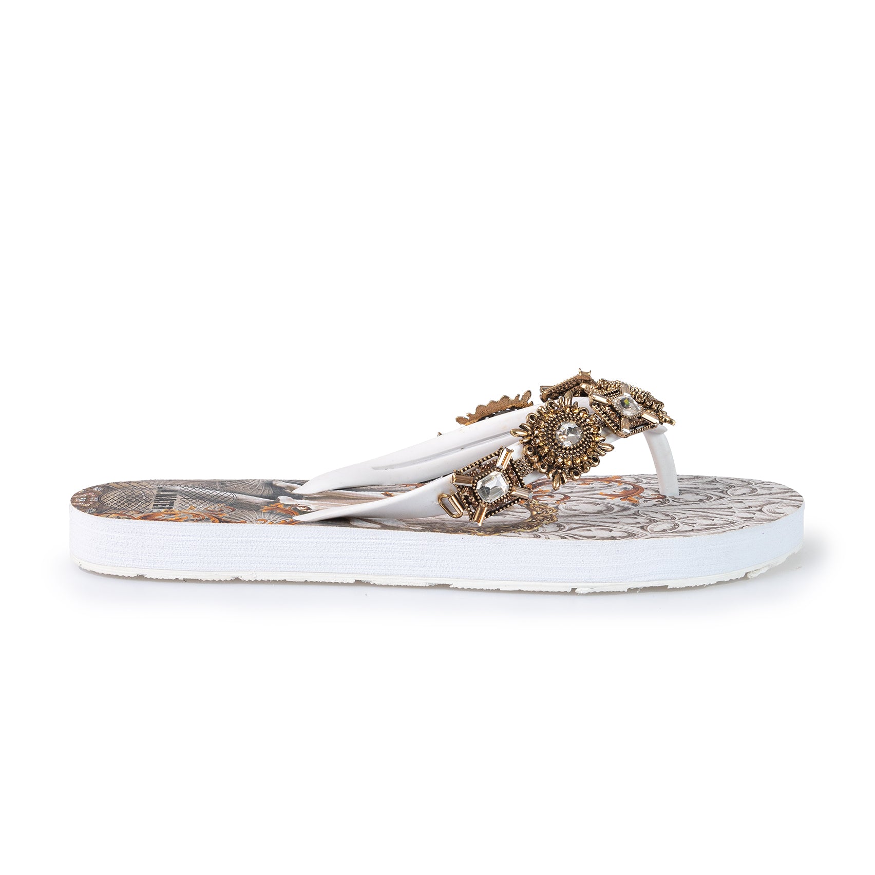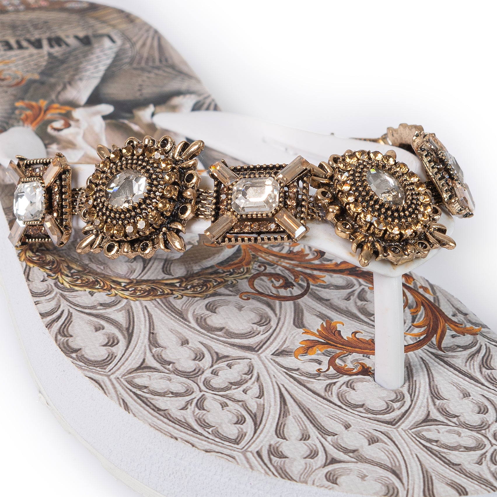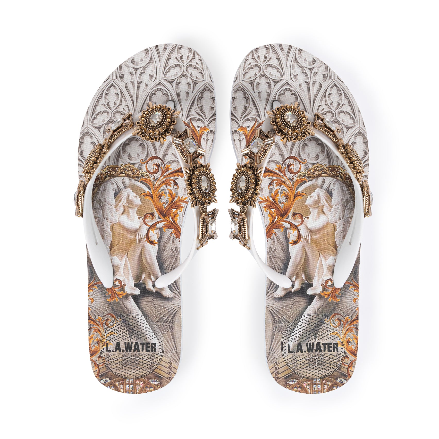 Infradito con motivi ispirati alle decorazioni dell'arte gotica nei toni del bianco e dell'oro. La tomaia presenta accessori in metallo color oro anticato e luminose pietre di cristallo. L.A. WATER offre lusso senza rinunciare al comfort; la morbida suola in gomma le rende ideali per essere indossate tutto il giorno.