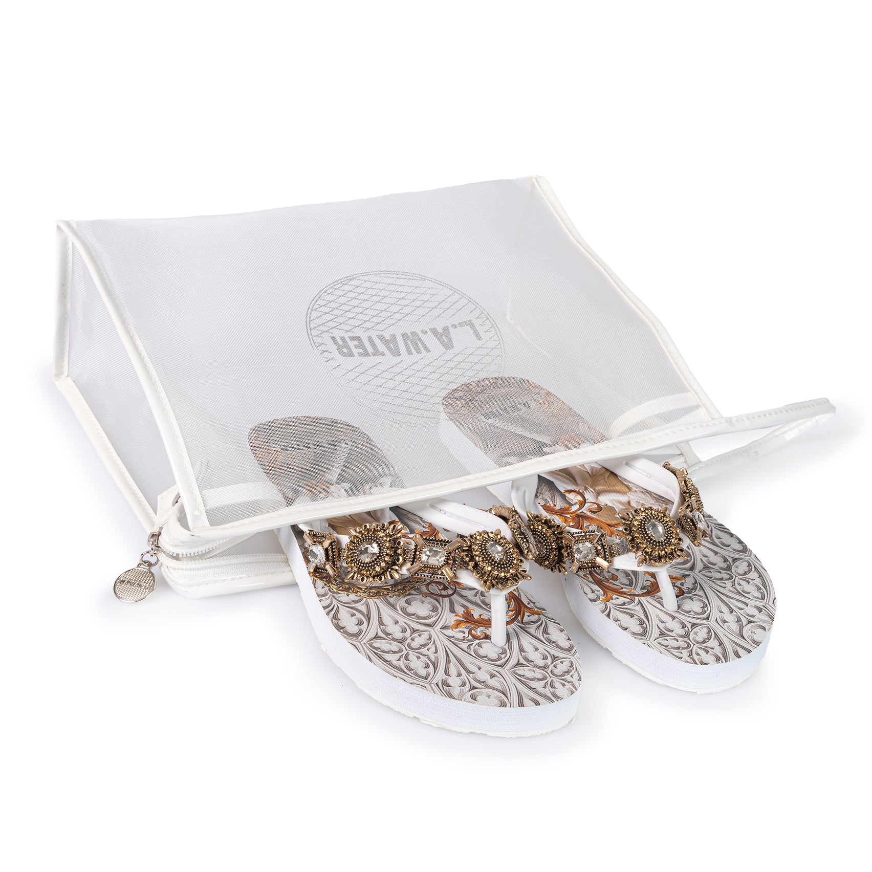 Packaging: Le infradito sono vendute in una pratica custodia in rete bianca con logo L.A. WATER, un accessorio glamour per la spiaggia o la città.