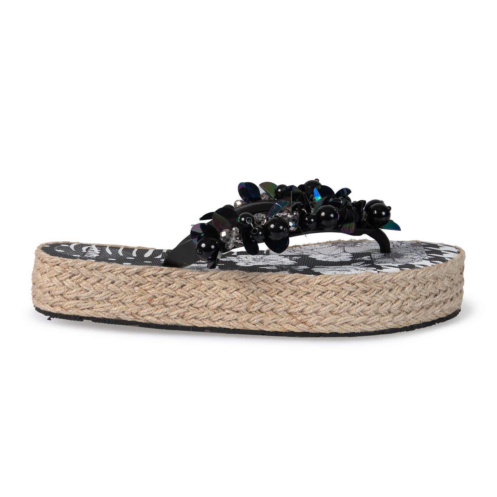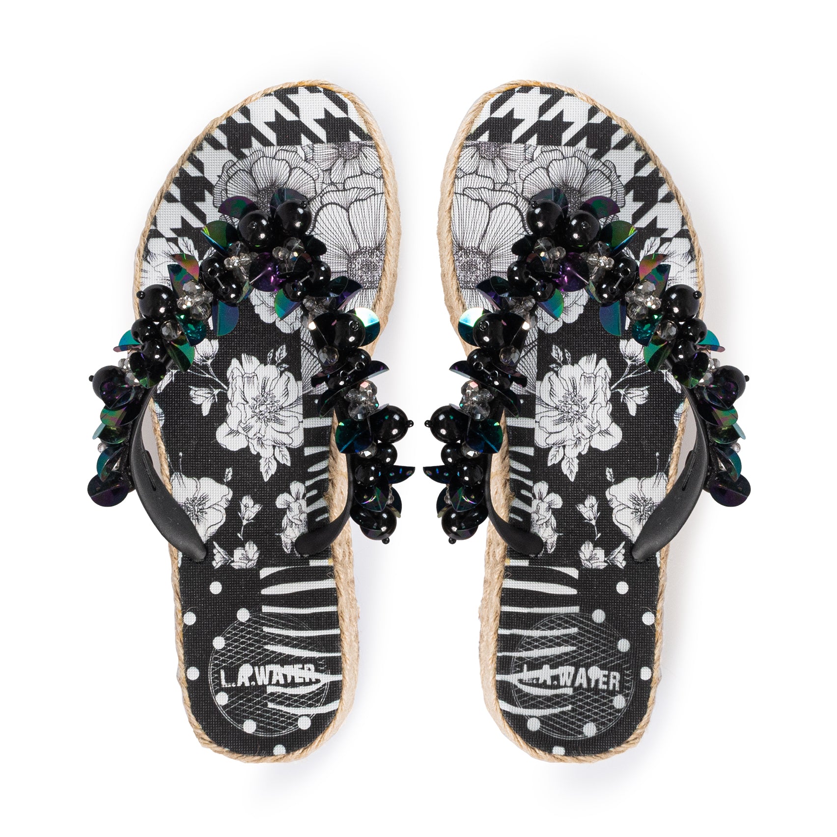 Informazioni tecniche: Suola in gomma avvolta in morbida corda, altezza 4 cm. Plantare antiscivolo dalla texture ruvida e suola esterna personalizzata con il logo L.A. WATER, per lasciare la tua impronta sulla sabbia a ogni passo. Tomaia realizzata con cinturini dotati di scanalature per il montaggio degli accessori, per garantire una finitura liscia. Tutti gli accessori sono montati a mano.