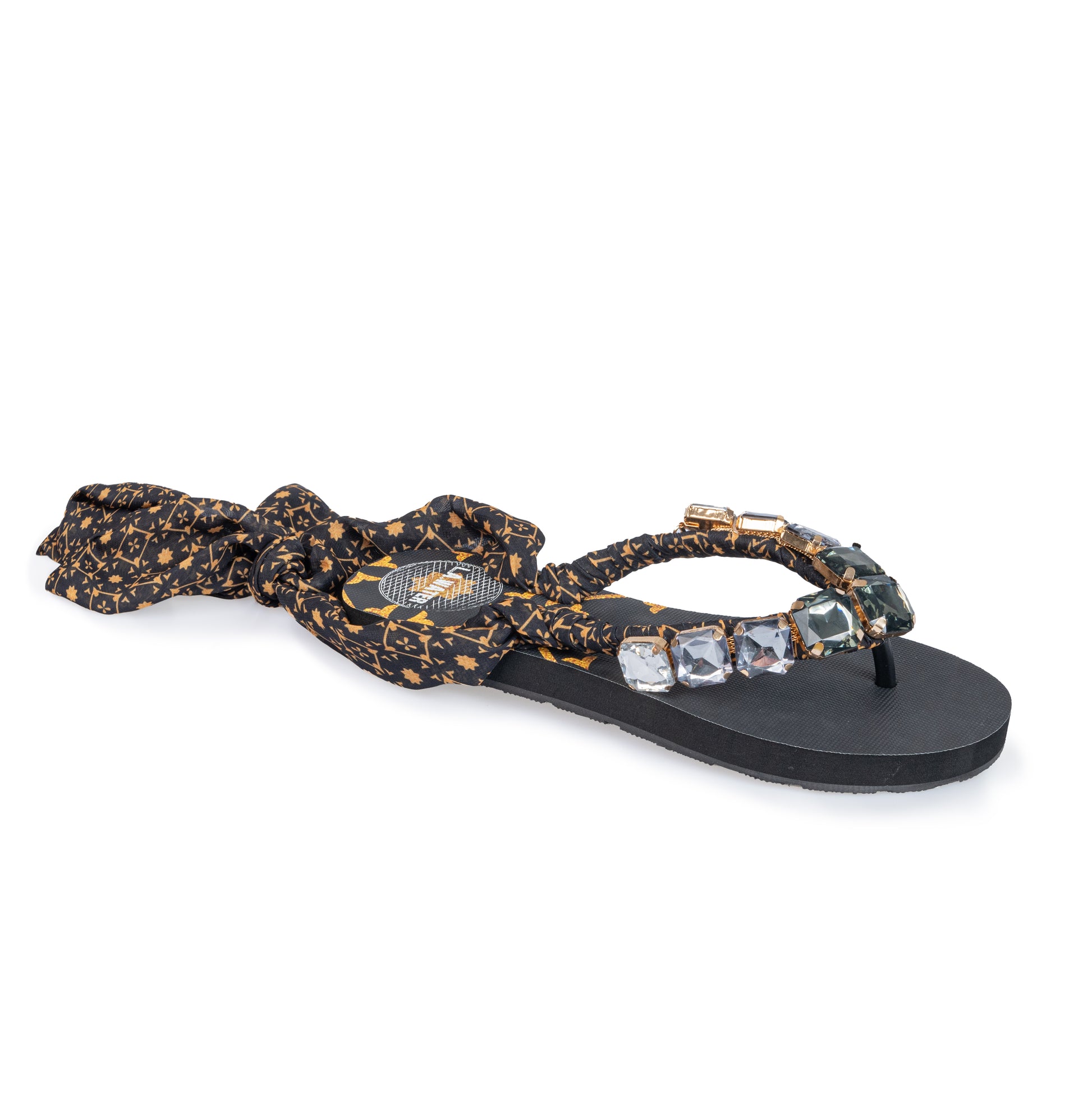 Sandalo foulard total black con decorazioni dorate sul tallone. Tomaia impreziosita da maxi pietre sfumate dal nero al cristallo. Tessuto foulard nero stampato con motivo dorato.