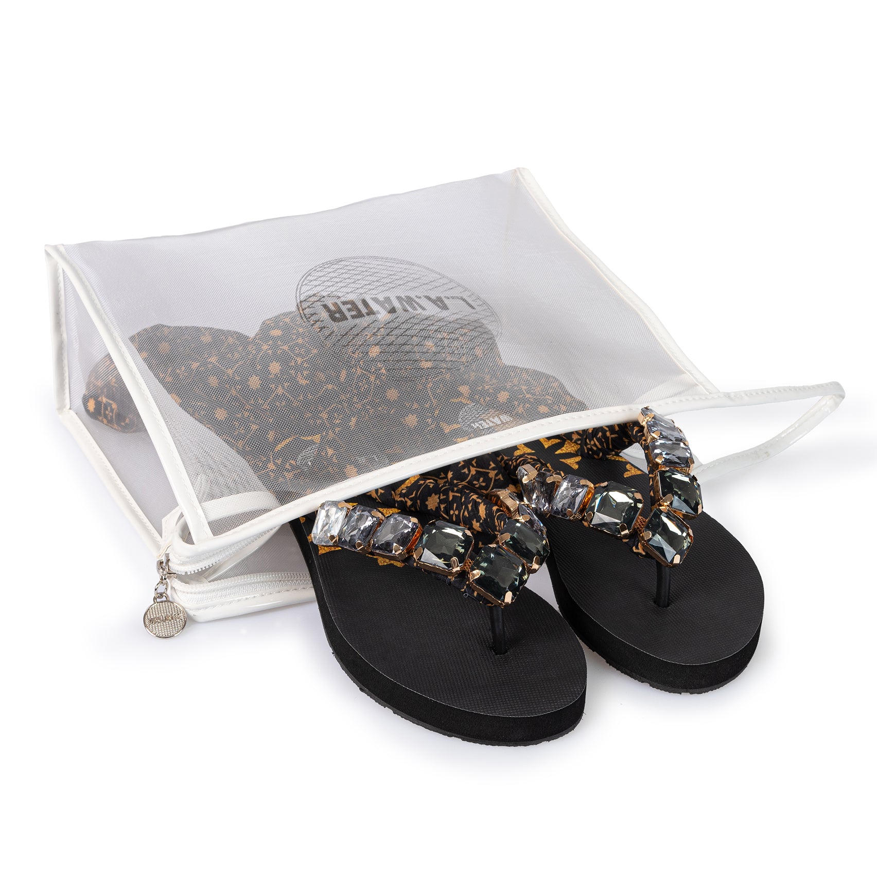 Packaging: Il sandalo è venduto in una pratica pochette in rete bianca con logo L.A. WATER, un accessorio glamour da indossare in spiaggia o in città.