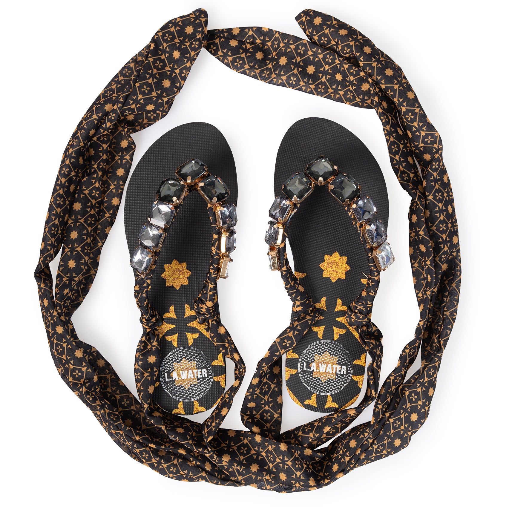 Informazioni tecniche: Suola in gomma, altezza 1,5-1,8 cm con leggero rialzo sul tallone per un maggiore comfort. Plantare con texture ruvida e antiscivolo e battistrada personalizzato con logo L.A. WATER, che lascia impronte sulla sabbia. Foulard in poliestere. Tomaia con fascette e scanalature per il montaggio degli accessori senza contatto con la pelle. Accessori montati a mano.