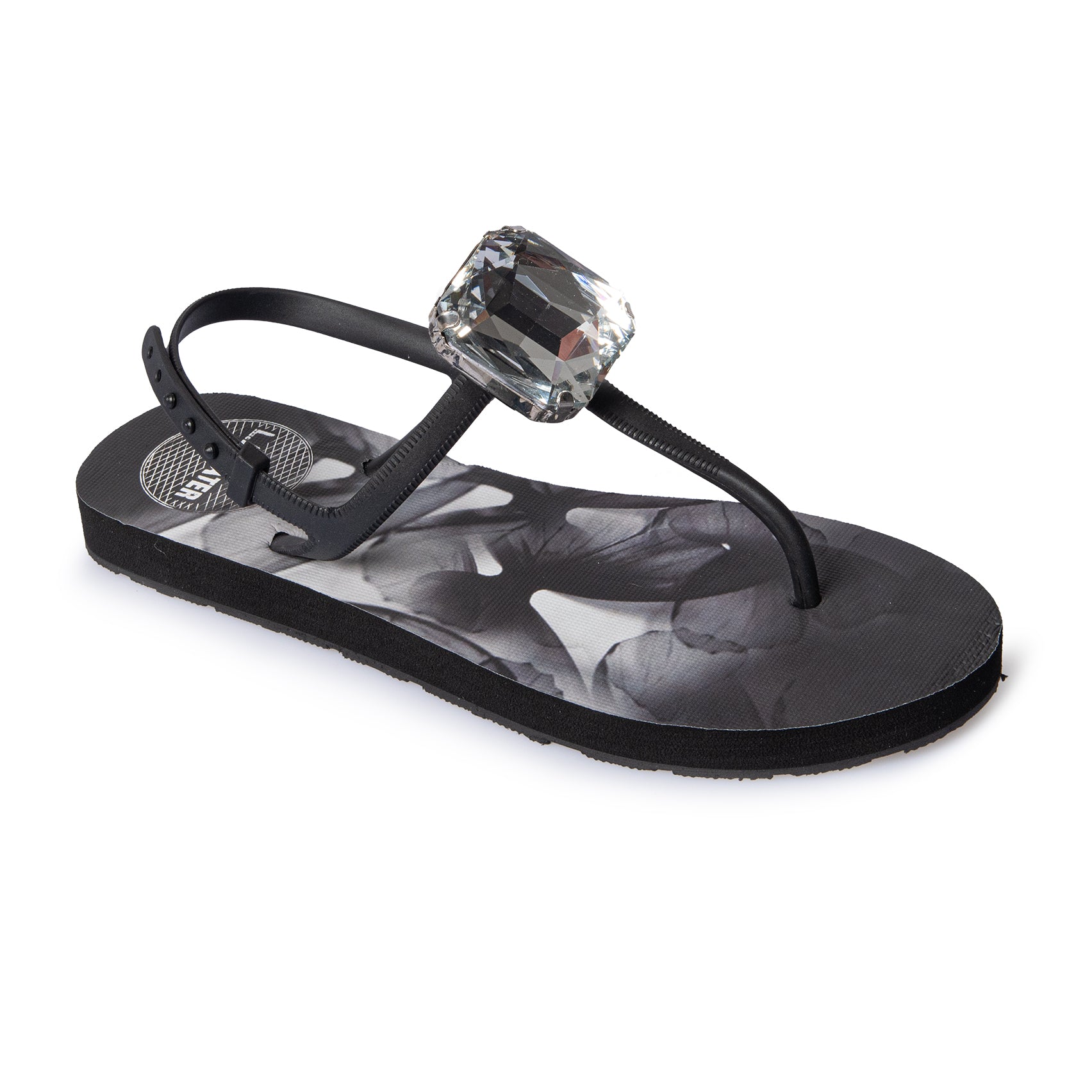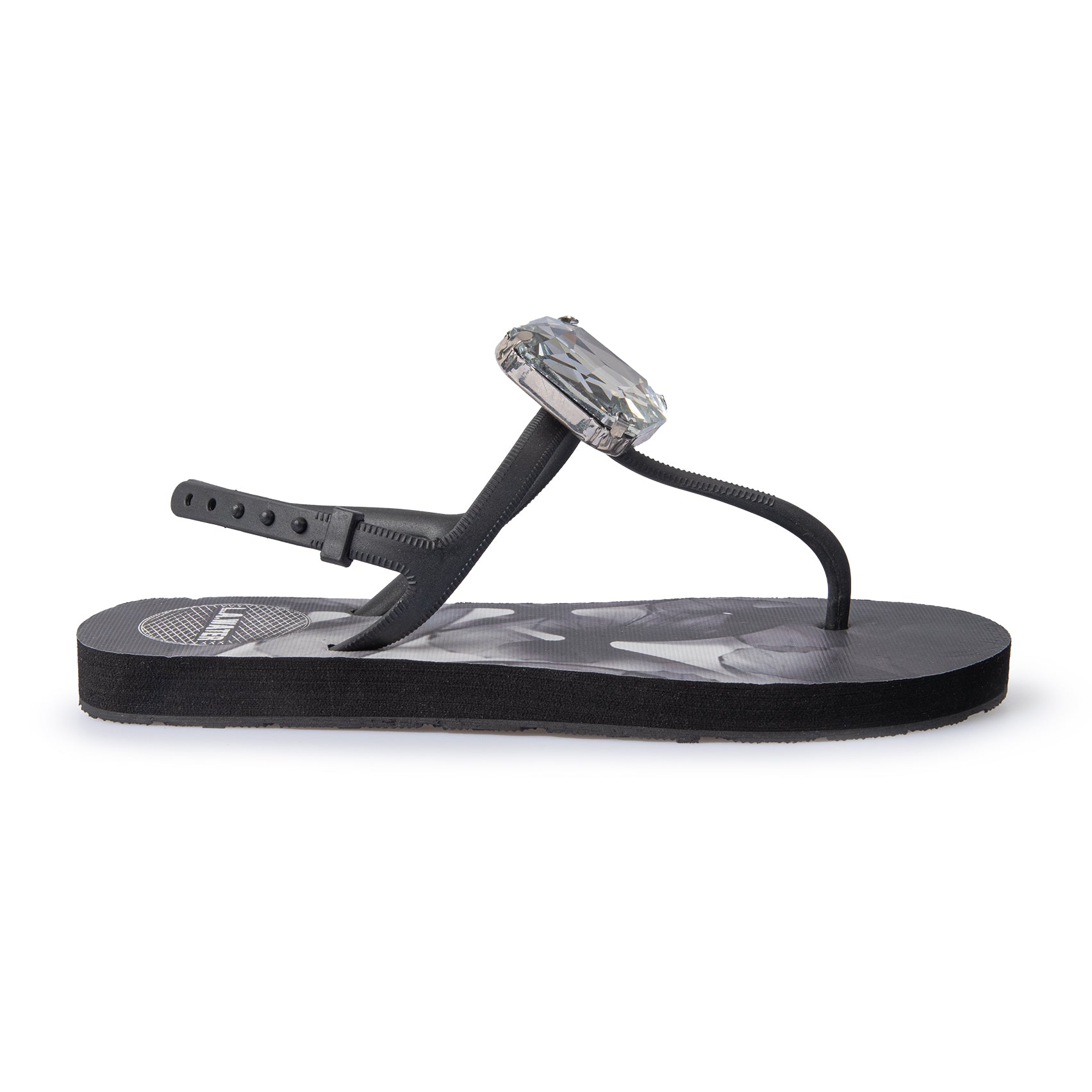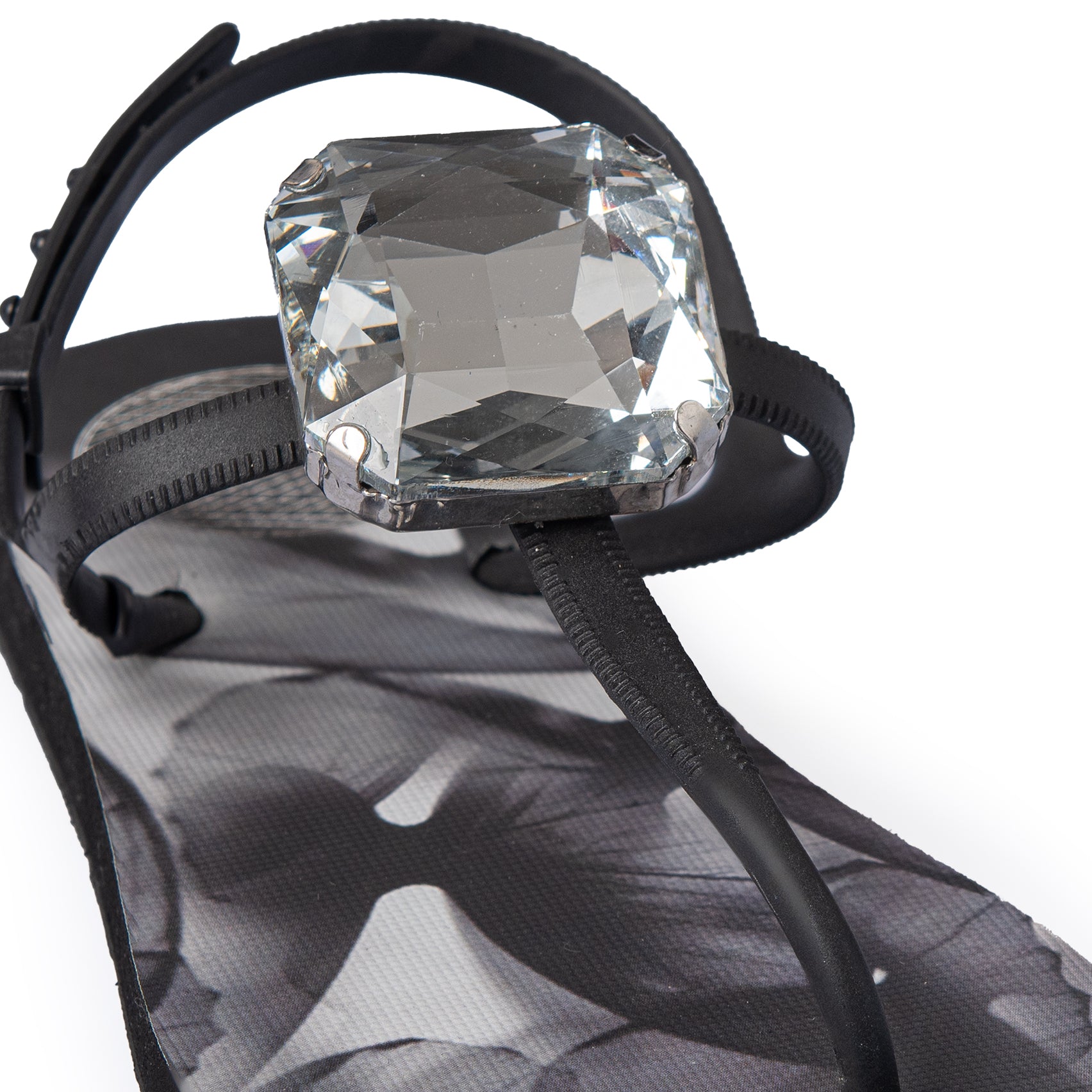 Sandalo infradito flat con suola nera e stampa di gigli bianchi, per un contrasto raffinato ed elegante. La tomaia in gomma nera è arricchita da un accessorio gioiello trasparente, taglio