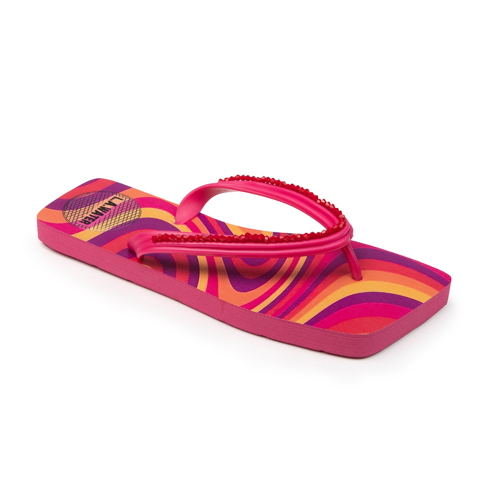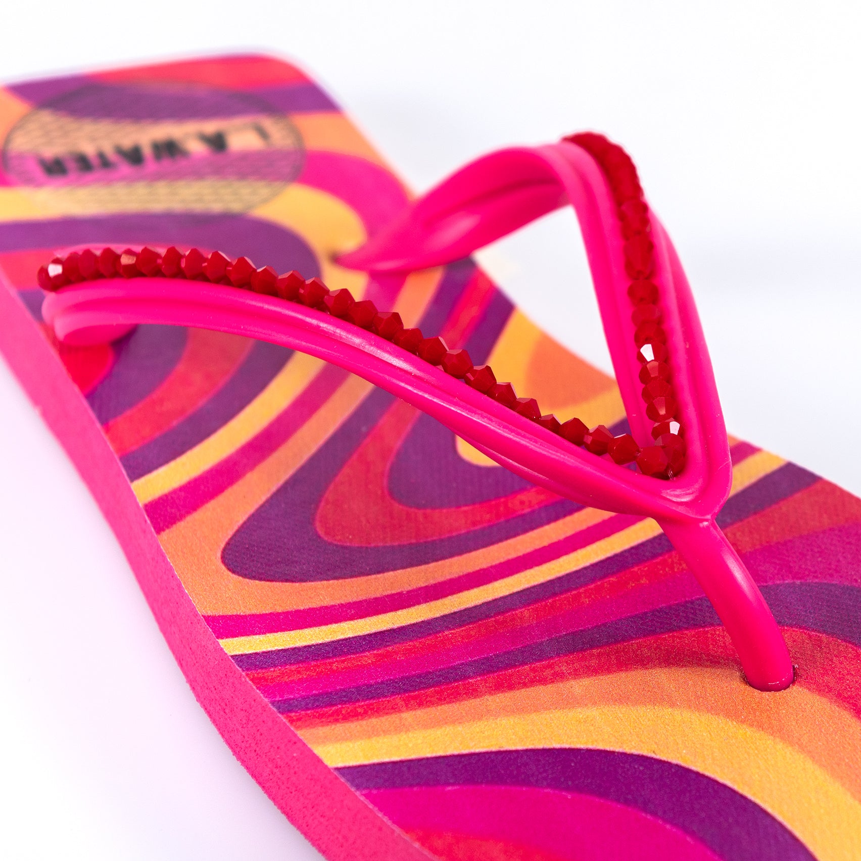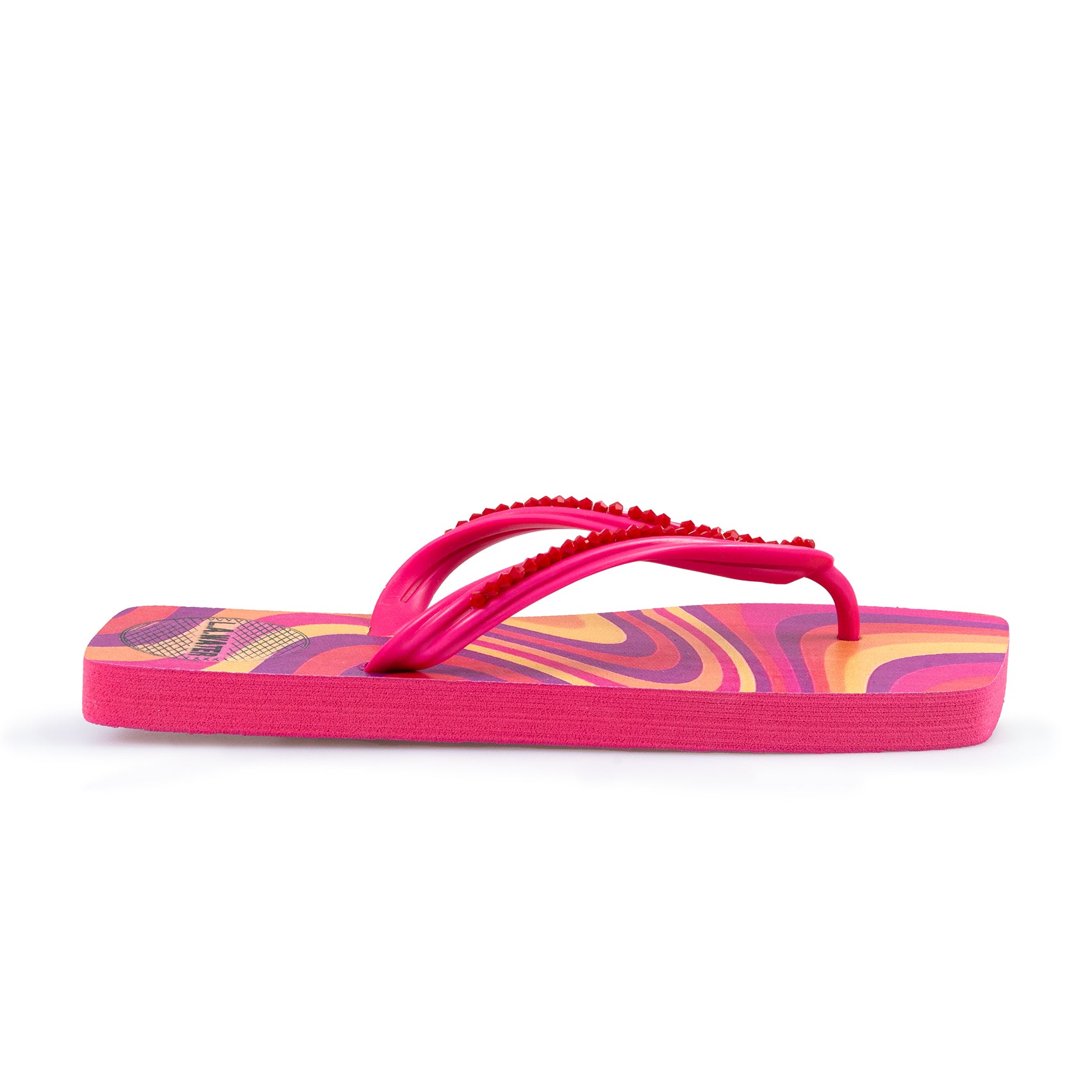 Infradito ispirata agli anni '70, nei toni multicolor del fucsia, dell'arancione, del giallo e del viola.