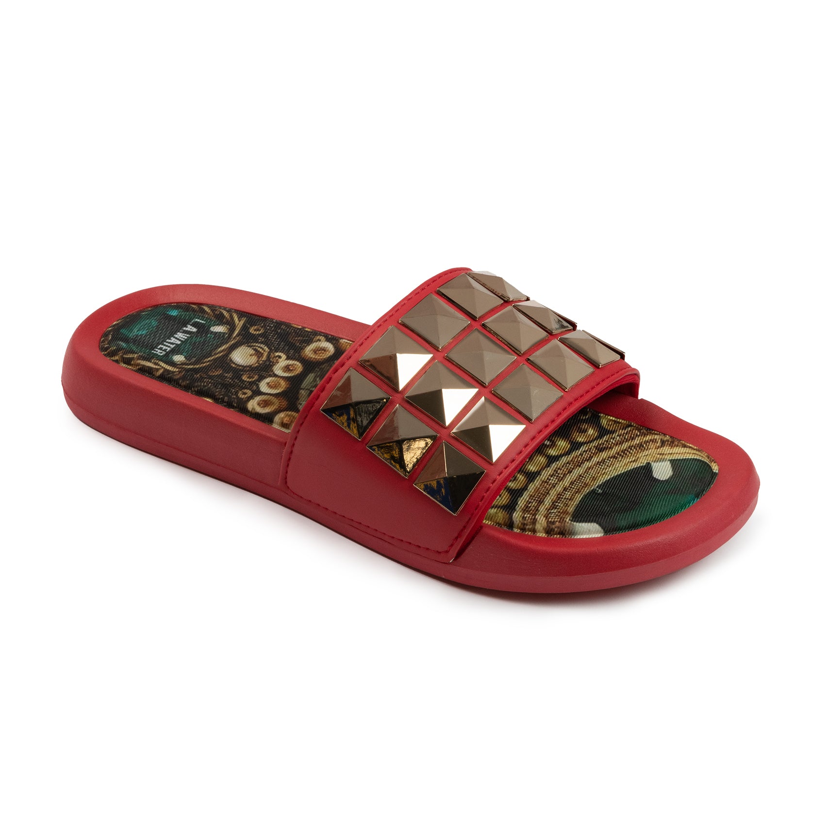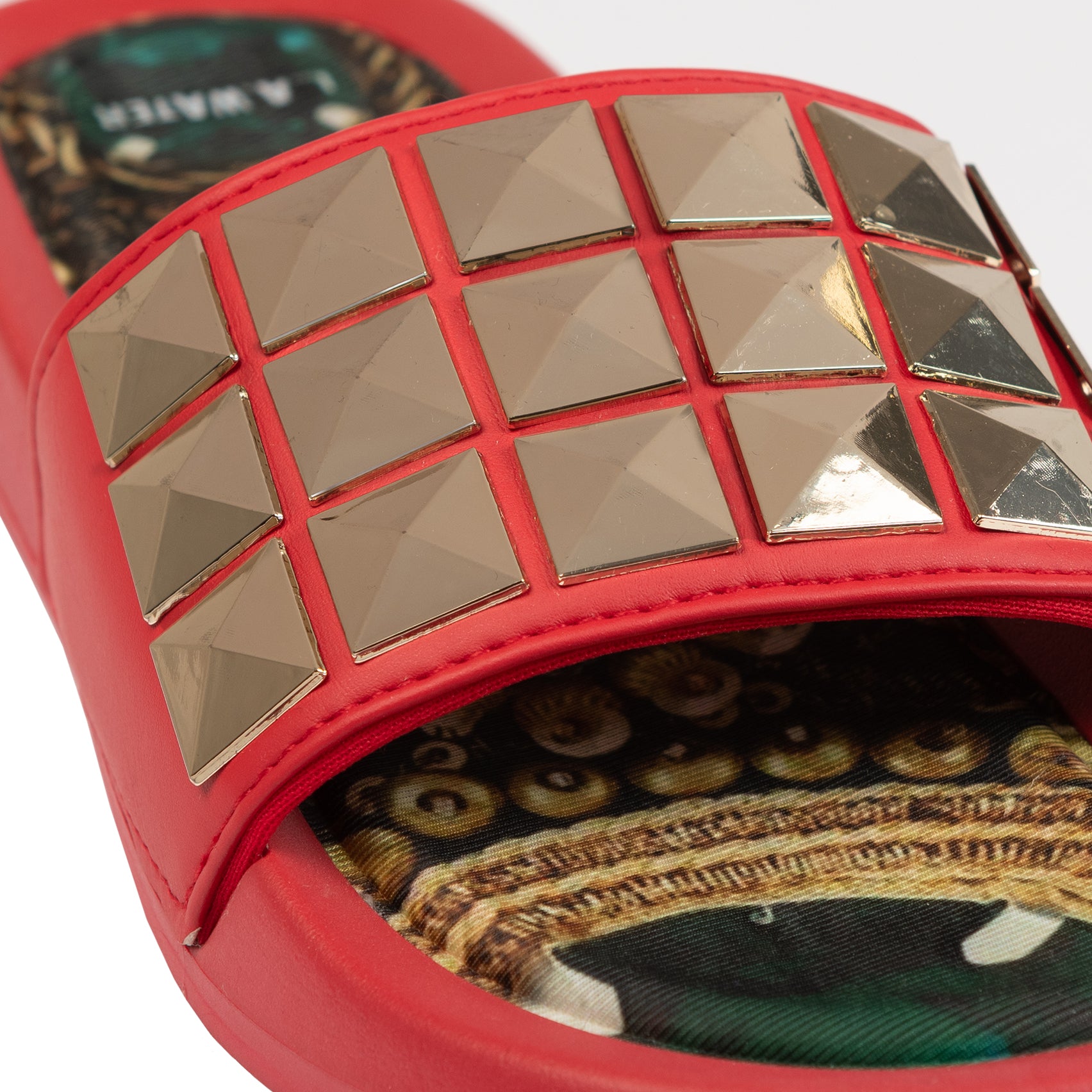 Sandali eleganti con motivo raffigurante gioielli e pietre scintillanti ispirate al mondo rock nei toni del rosso e del nero.
