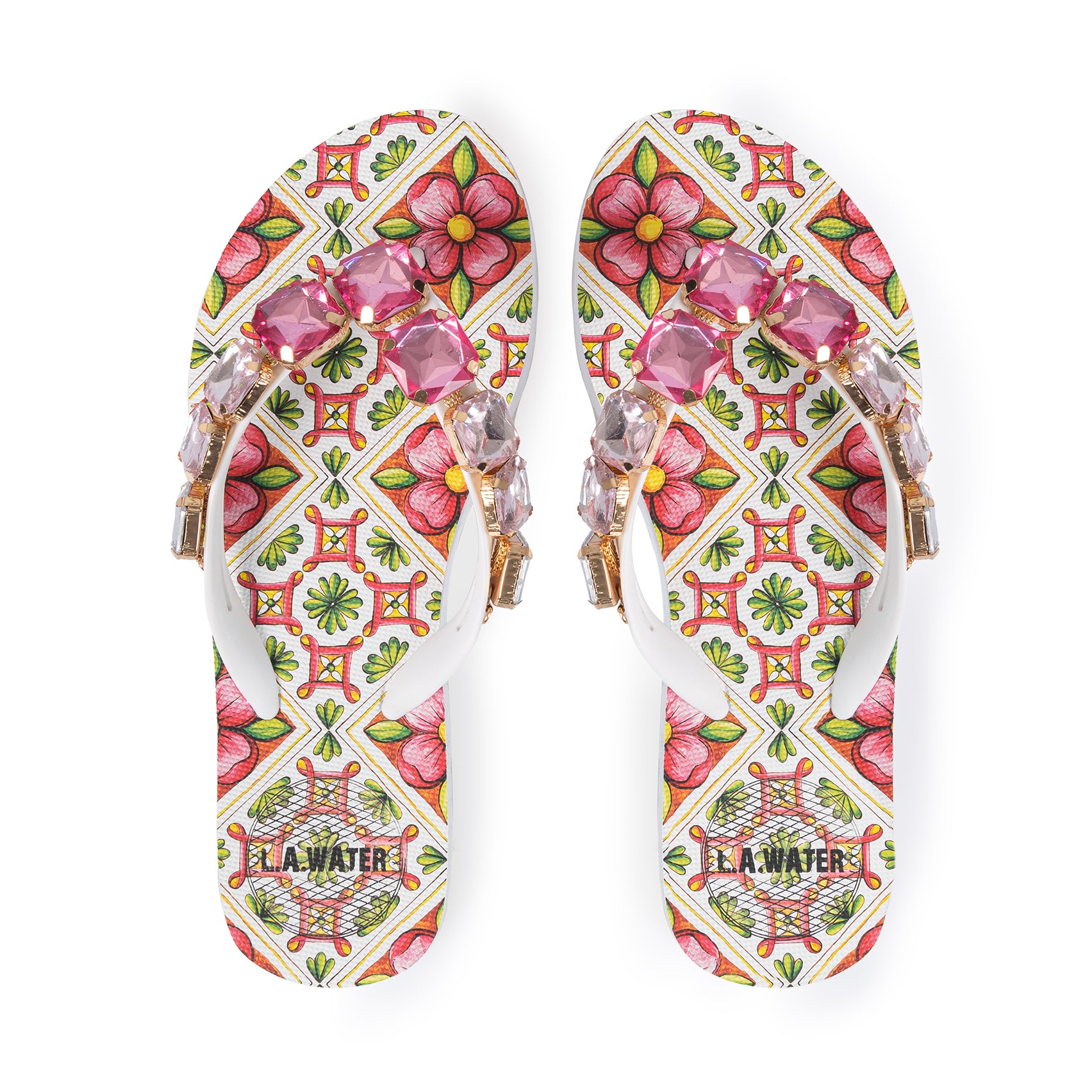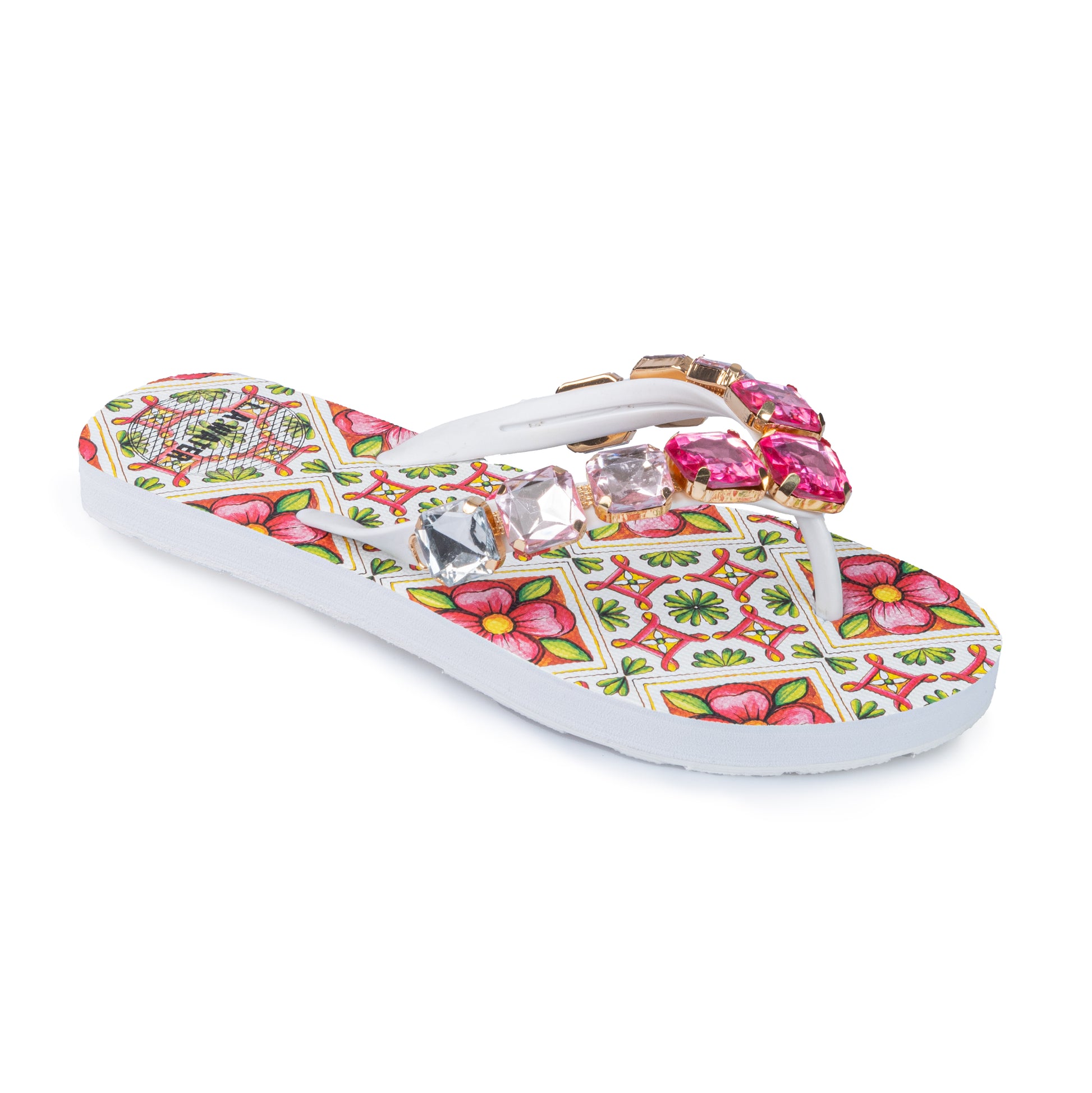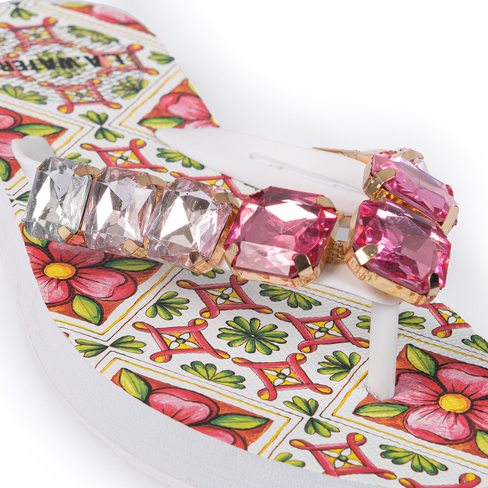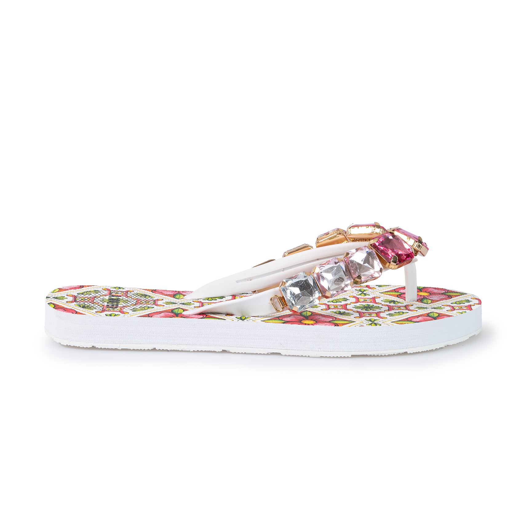 Sandali infradito con motivo ispirato alle maioliche siciliane nei toni del rosa. La tomaia è impreziosita da maxi pietre geometriche luminose in tonalità sfumate dal fucsia al cristallo.