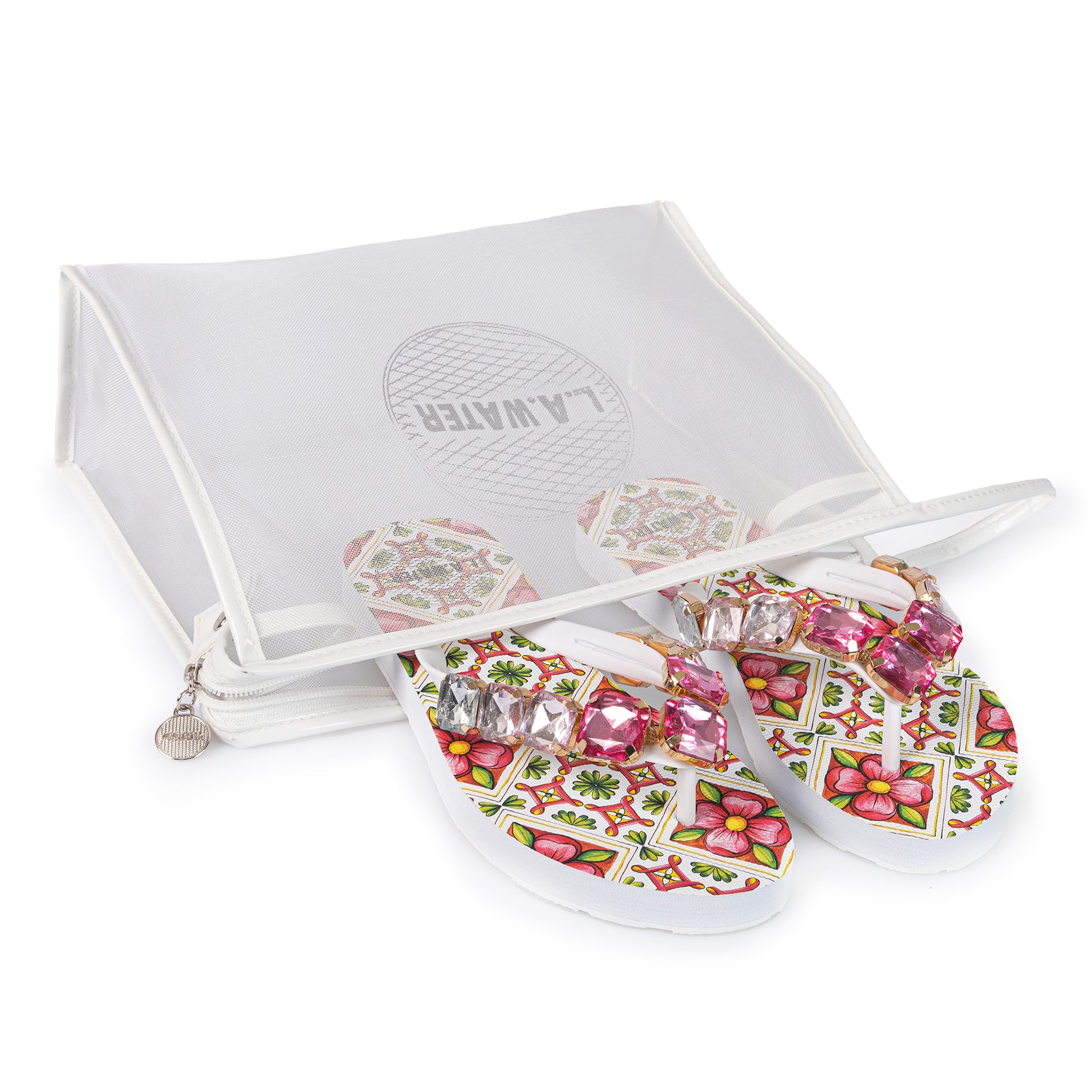 Packaging: I sandali sono venduti in una pratica pochette in rete bianca con logo L.A. WATER, un accessorio glamour da indossare in spiaggia o in città.