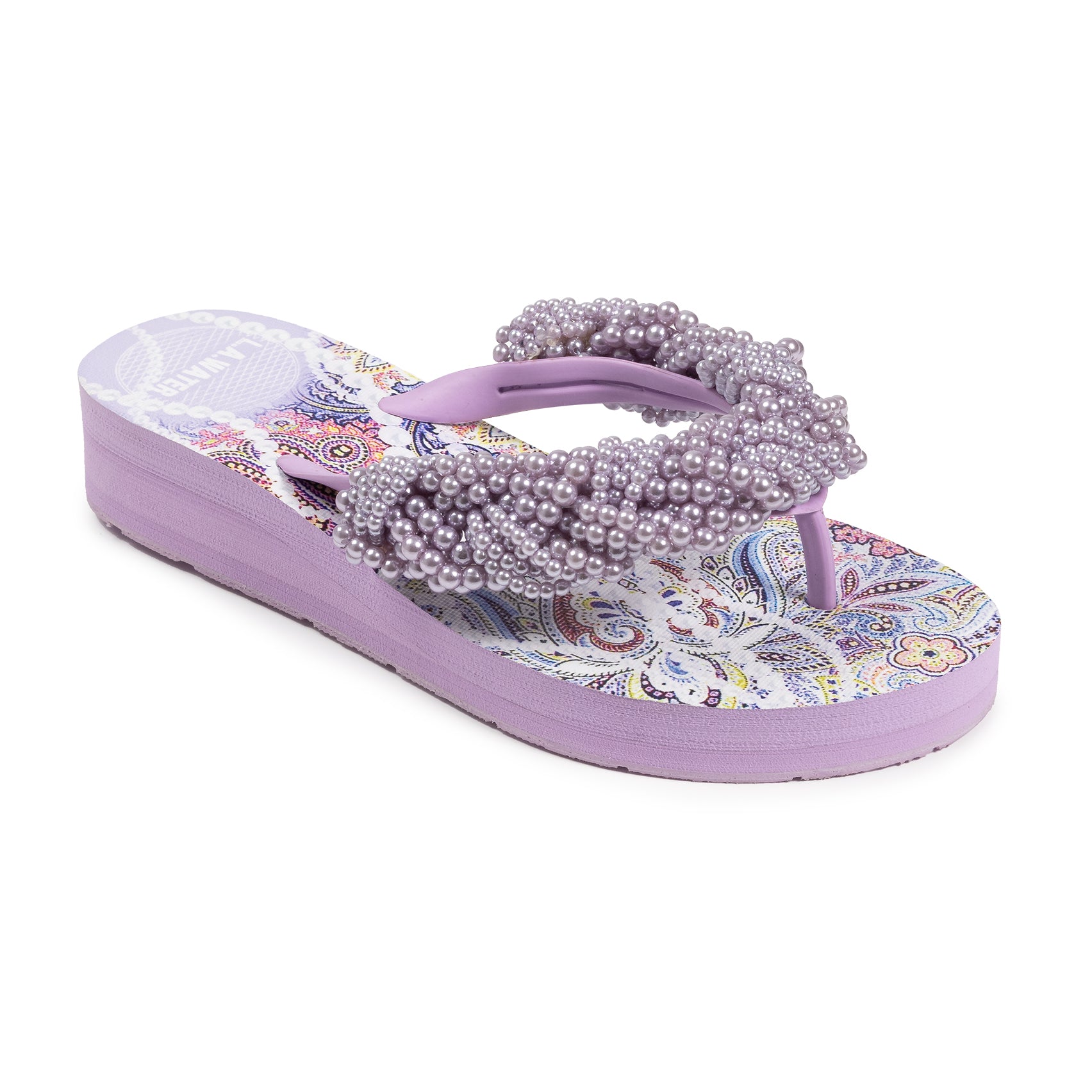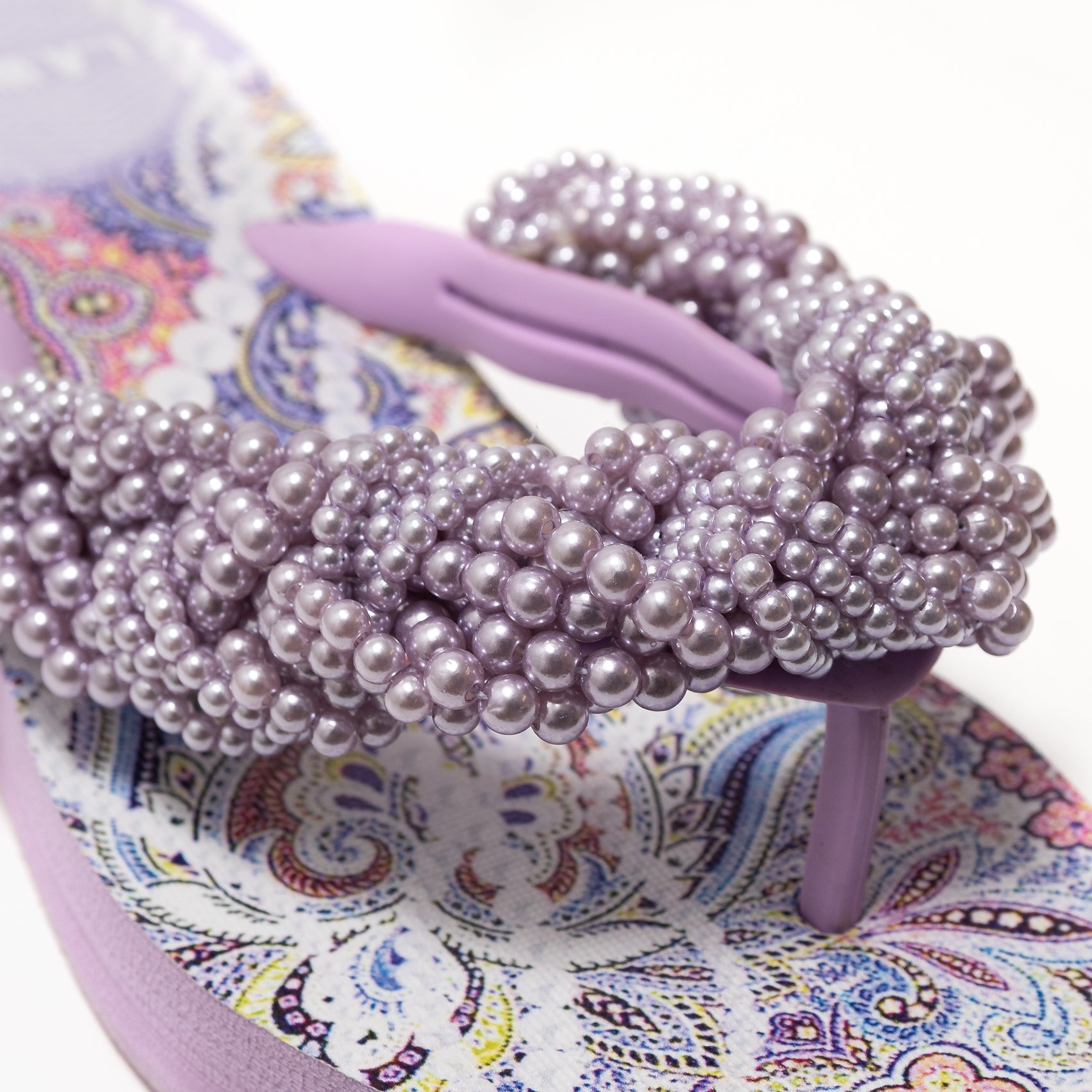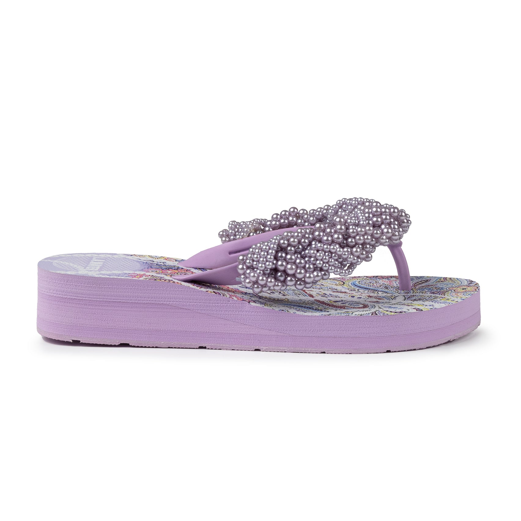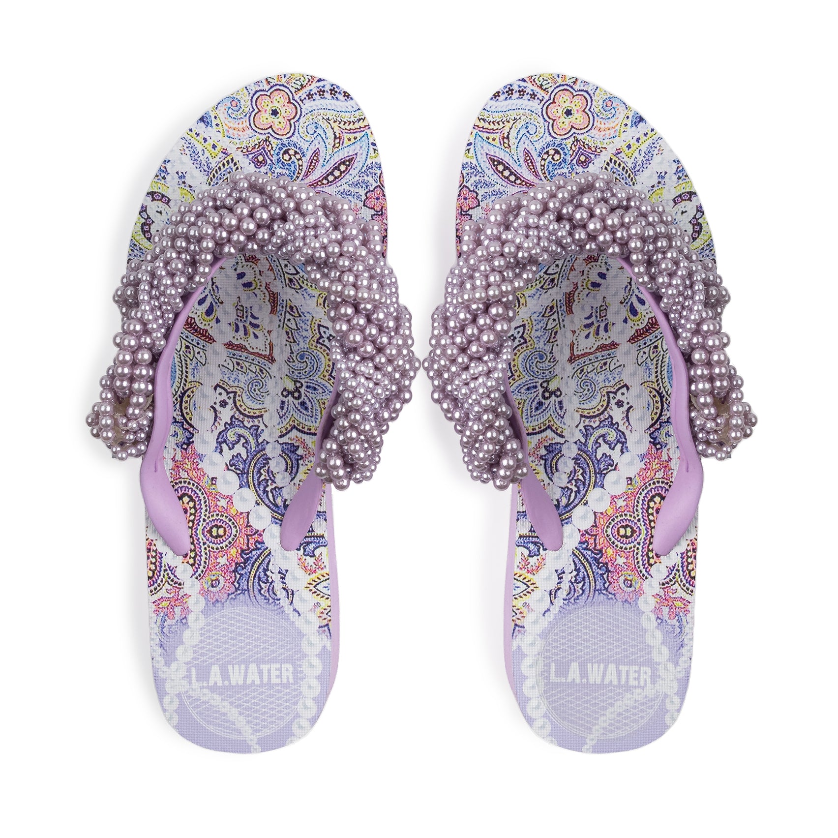 Sandalo infradito ispirato al mondo del paisley sui toni del lilla.