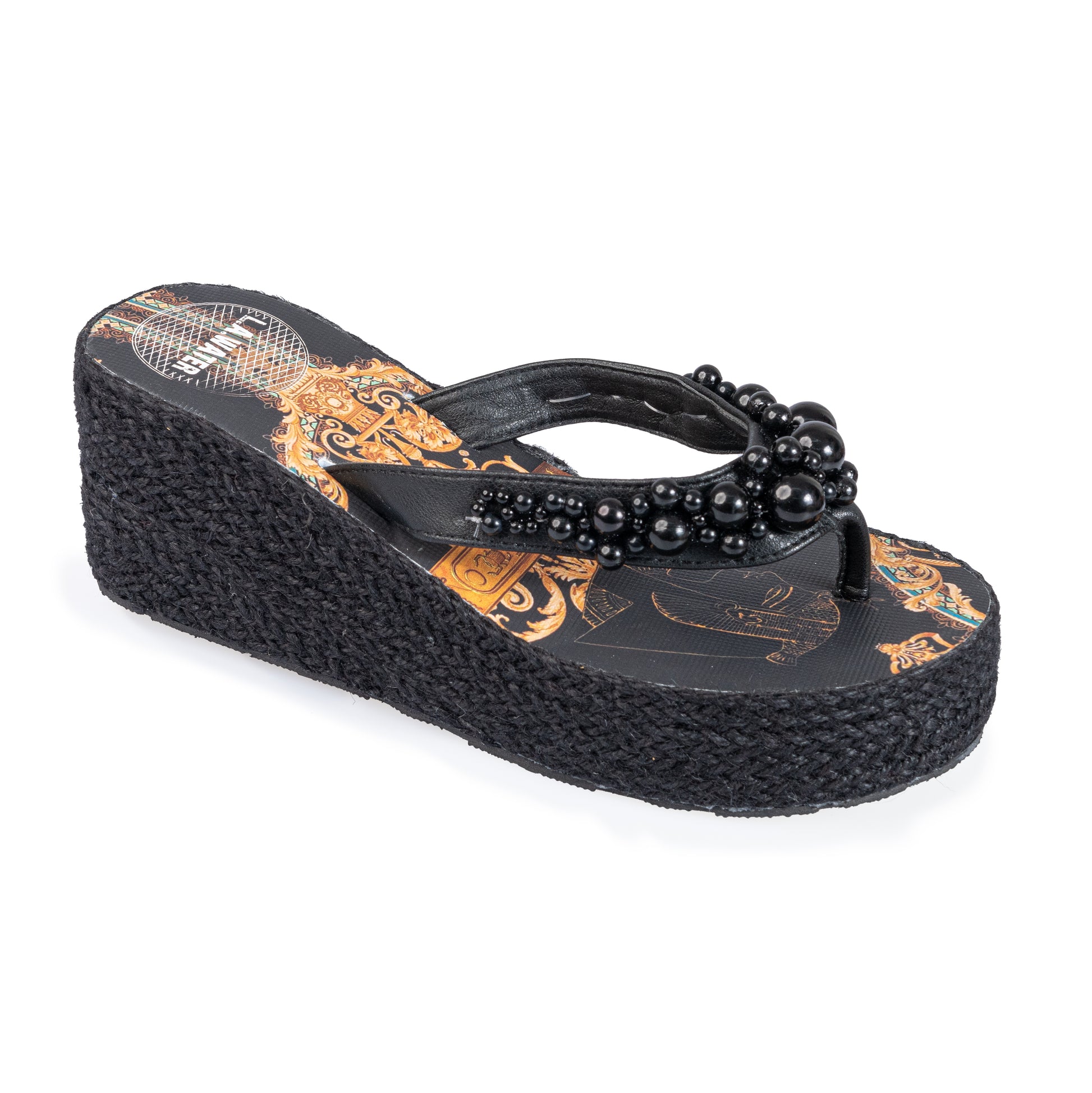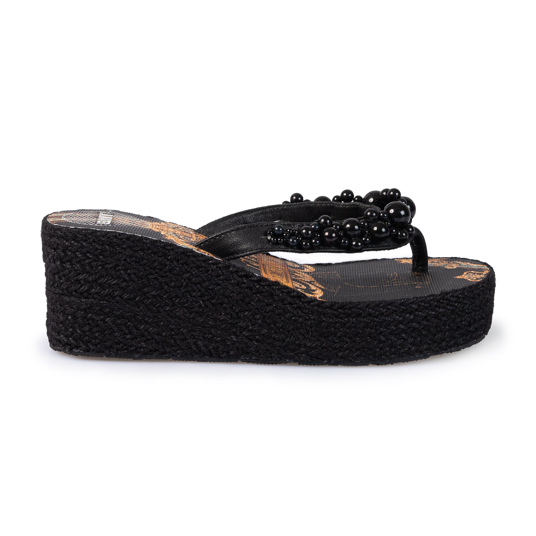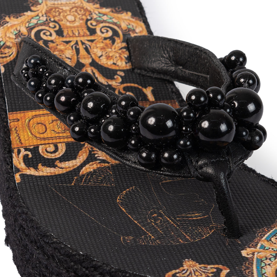 Sandalo zeppa con pattern ispirato all’arte egizia sui toni del nero e oro.