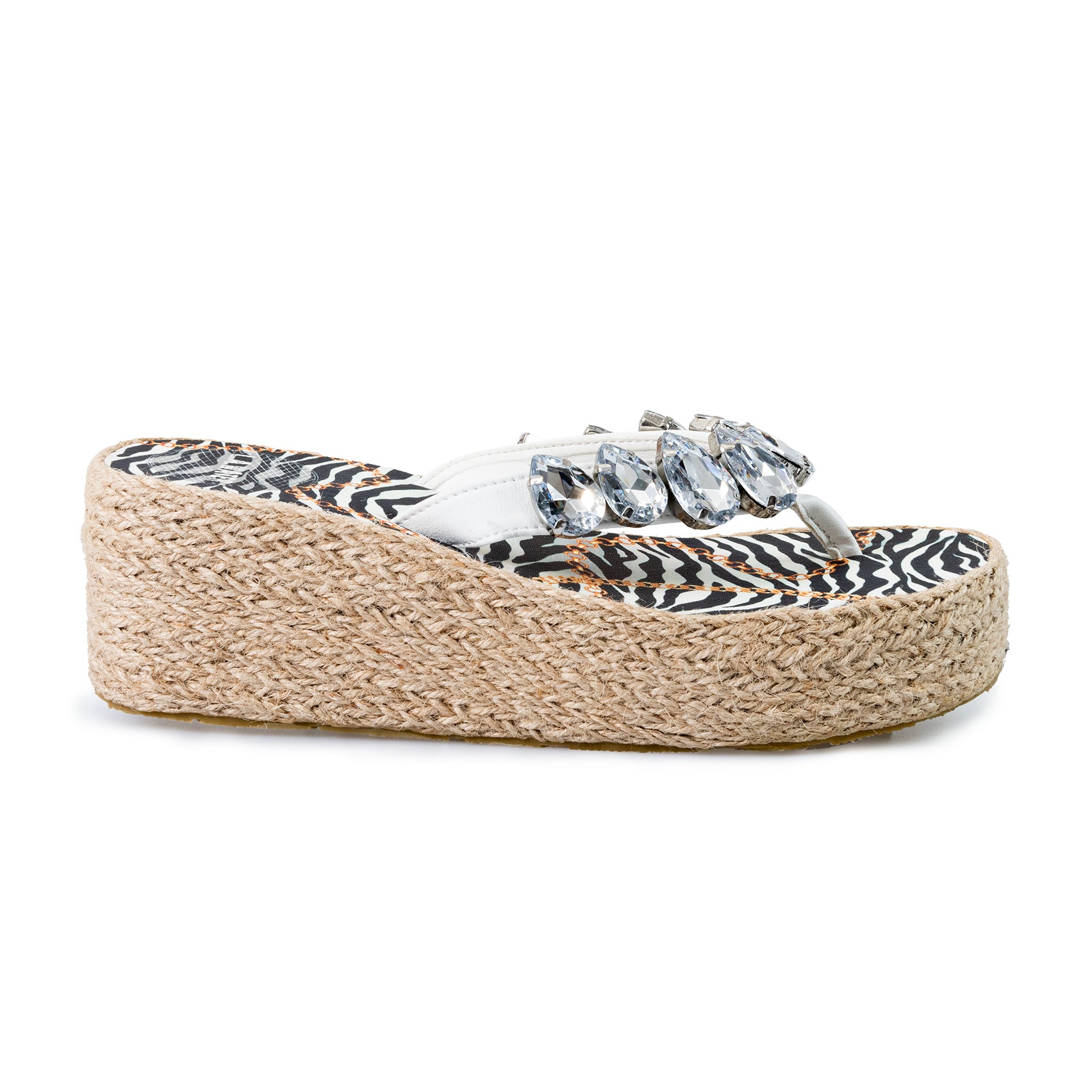 Sandalo con zeppa dal design raffinato con motivo zebrato e catene dorate.