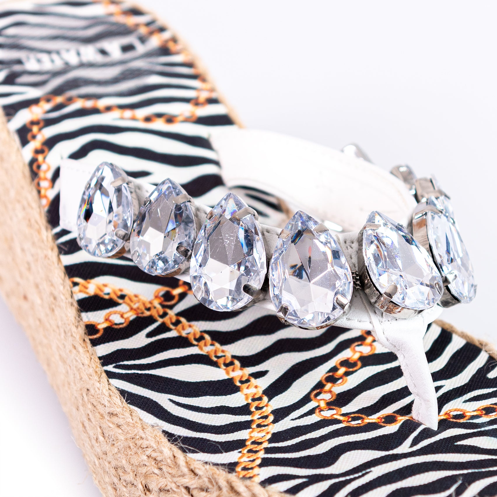 Tomaia in similpelle con accessori gioiello montati a mano.